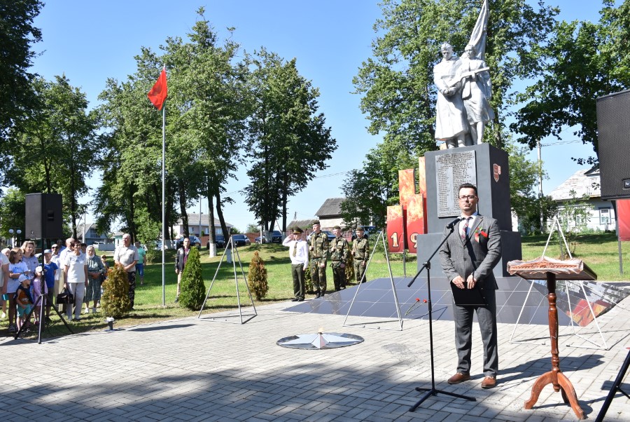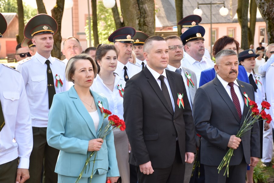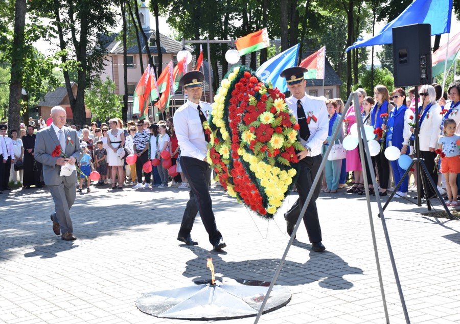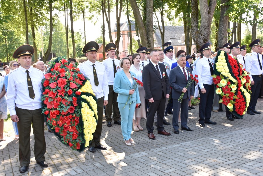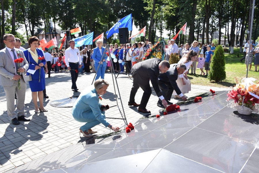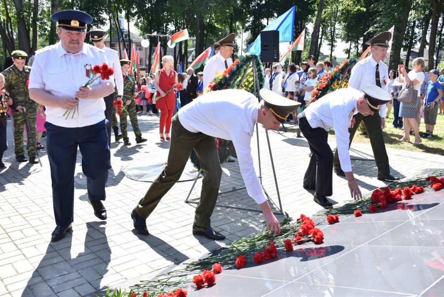 … Хвіліна маўчання. Гулкім рэхам разносіцца па наваколлі залп салюту. Да падножжа помніка загінуўшым героям ускладаюцца вянкі і жывыя кветкі ад раённага выканаўчага камітэта і раённага Савета дэпутатаў, прадпрыемстваў і арганізацый горада, грамадскіх аб’яднанняў, палітычных партый, моладзі і рэлігійных арганізацый, савета ветэранаў.