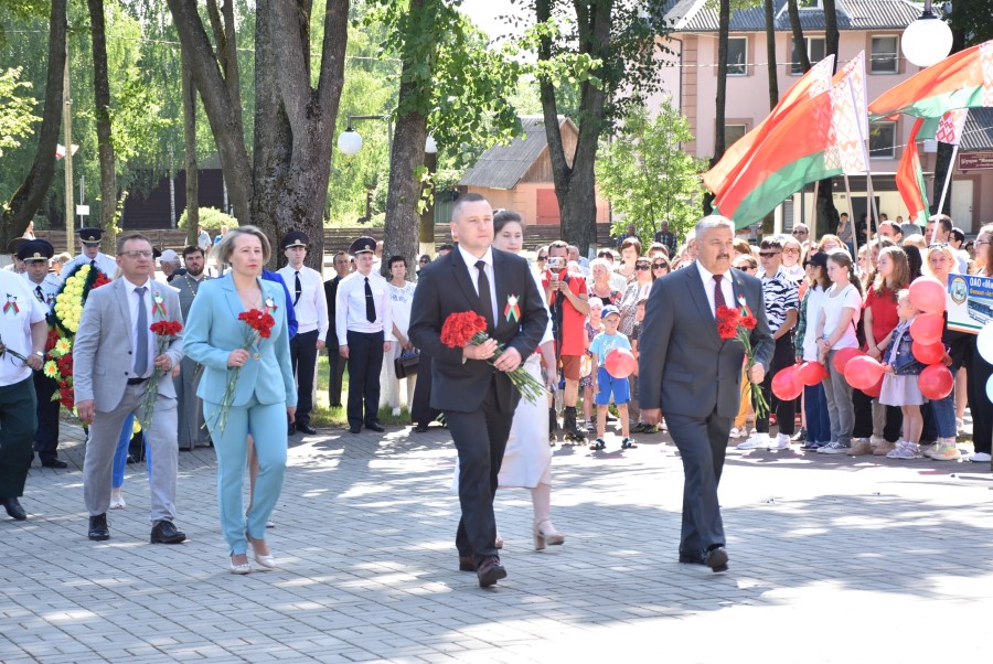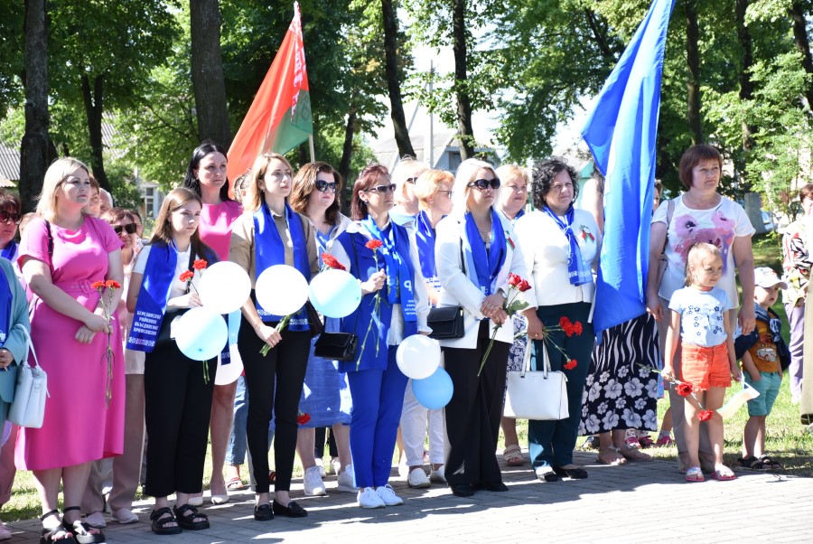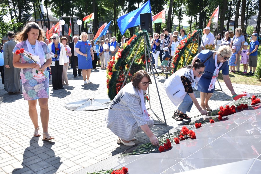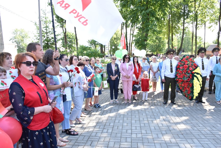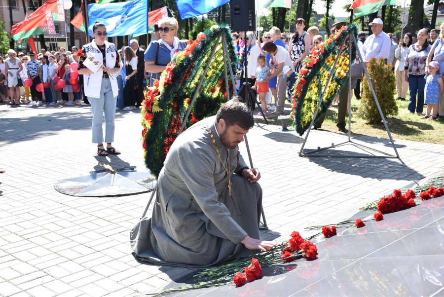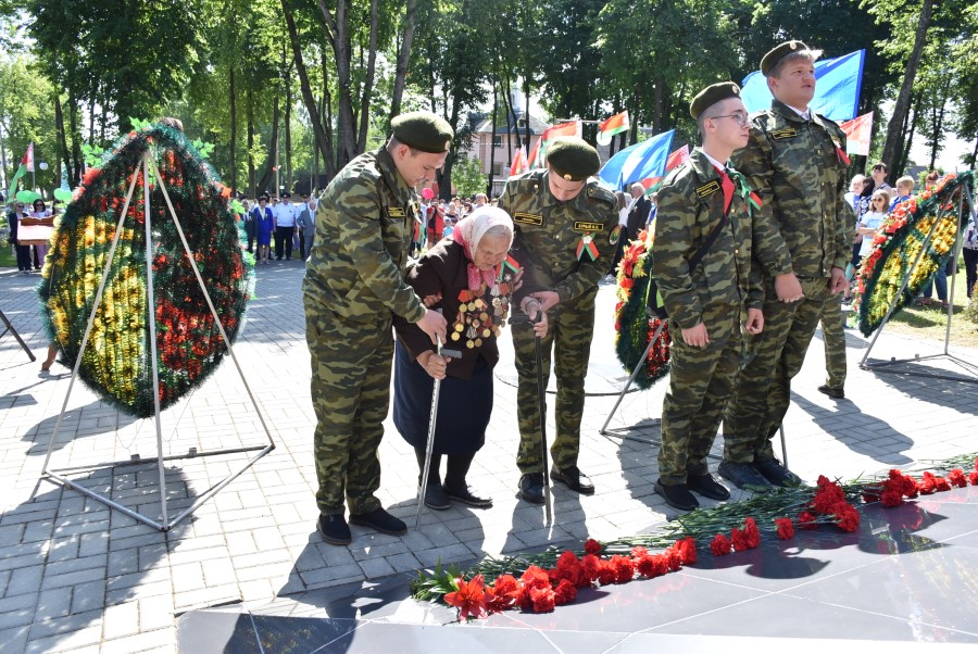 … Хвіліна маўчання. Гулкім рэхам разносіцца па наваколлі залп салюту. Да падножжа помніка загінуўшым героям ускладаюцца вянкі і жывыя кветкі ад раённага выканаўчага камітэта і раённага Савета дэпутатаў, прадпрыемстваў і арганізацый горада, грамадскіх аб’яднанняў, палітычных партый, моладзі і рэлігійных арганізацый, савета ветэранаў.
