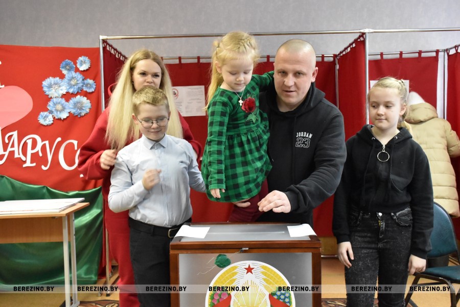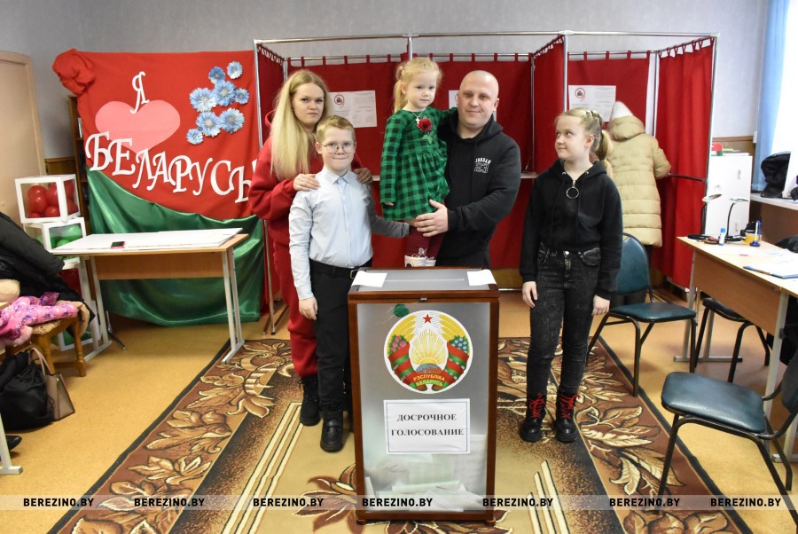 Всей семьёй пришли проголосовать досрочно на свой избирательный участок №3, который располагается в Березинской гимназии, Ольга и Михаил Круглик с детьми – Романом, Софией и Дарьей.