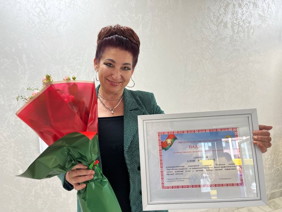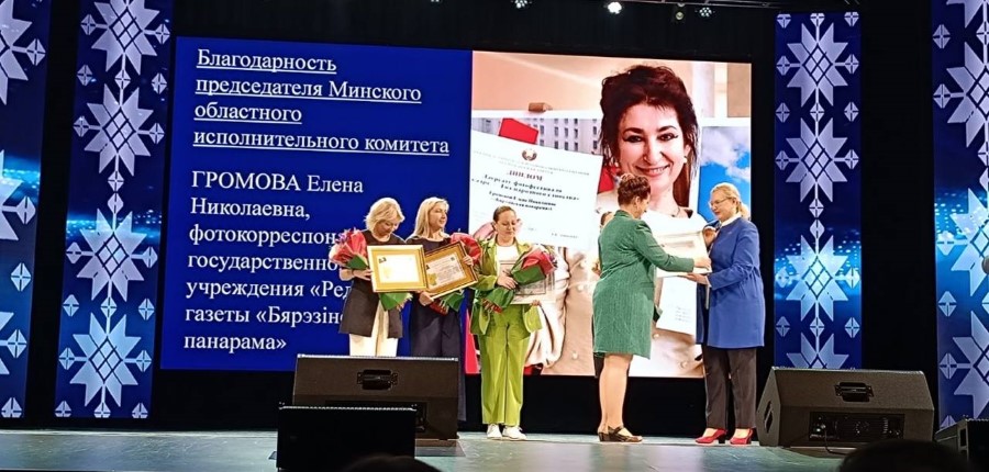 За добросовестный труд, высокий профессионализм, значительны личный вклад в развитие средств массовой информации Минской области Благодарность председателя Минского областного исполнительного комитета объявлена фотокорреспонденту районной газеты «Бярэзінская пагарама” Громовой Елене Николаевне.