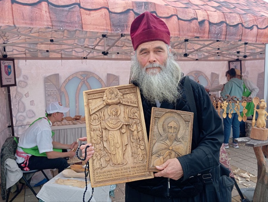 - Можна і так сказаць: я мастак па адукацыі, заканчваў Бабруйскае мастацкае вучылішча яшчэ ў 1988 годзе. Святаром ужо дваццаць шосты год. Выразаю іконы. Вера садзейнічае змяніць накіраванасць у творчасці са свецкіх вырабаў да духоўных: крыжы з Распяццем, іконы. Сёння прыйшоў паглядзець на свята, паказаць вырабы. Здольнасць мастацтва перадаць благадаць гэта таксама ў нейкай меры кшталту таінства. Духоўны пачатак натхняе на творчасць. Займаюся выразаннем ікон з канца 80-х.