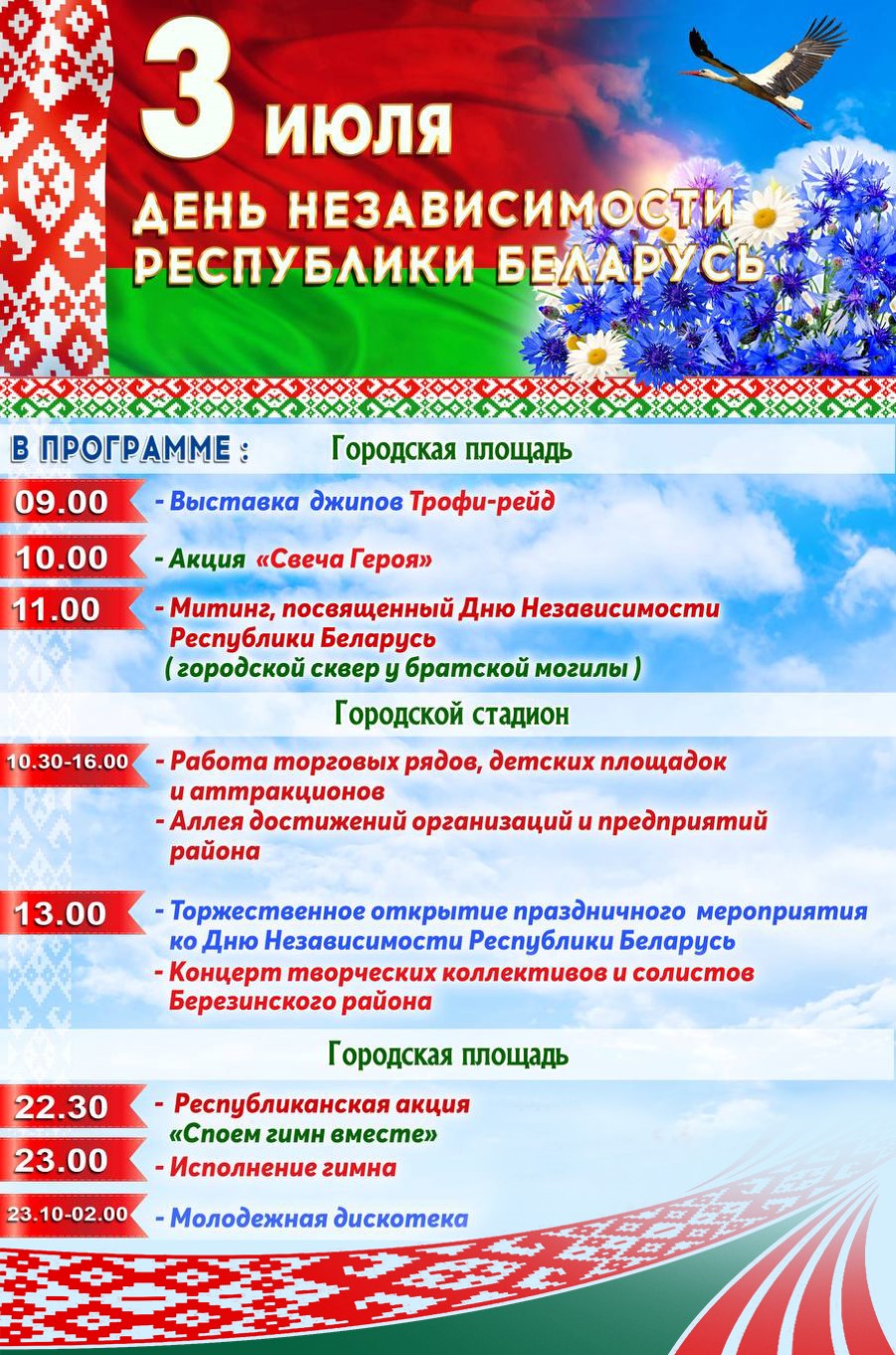 Уважаемые березинцы и гости города! Приглашаем на праздничные мероприятия, посвященные Дню Независимости Республики Беларусь!