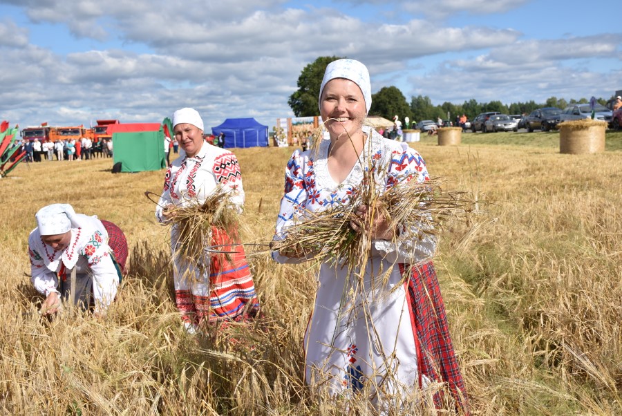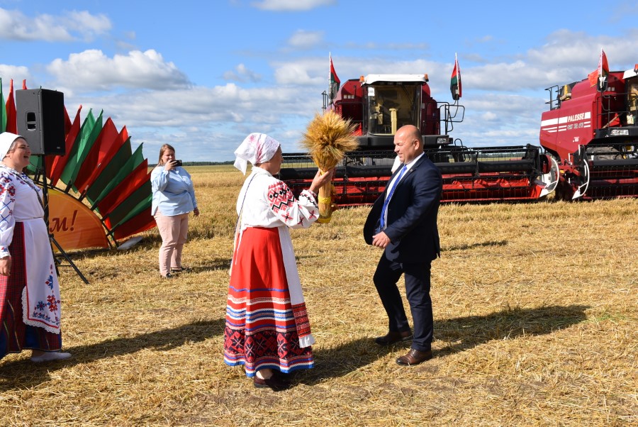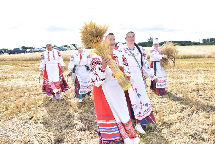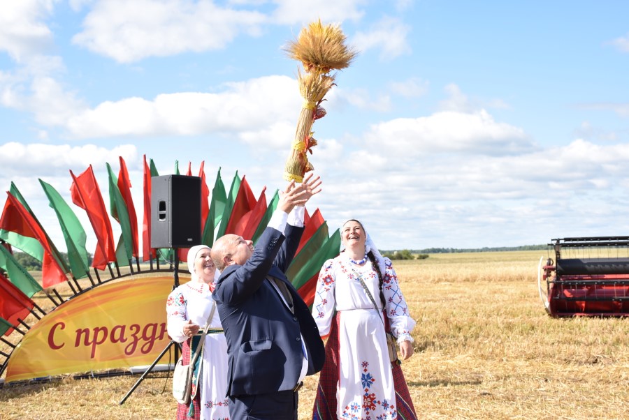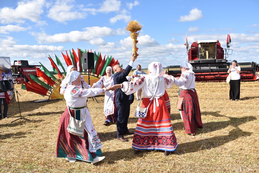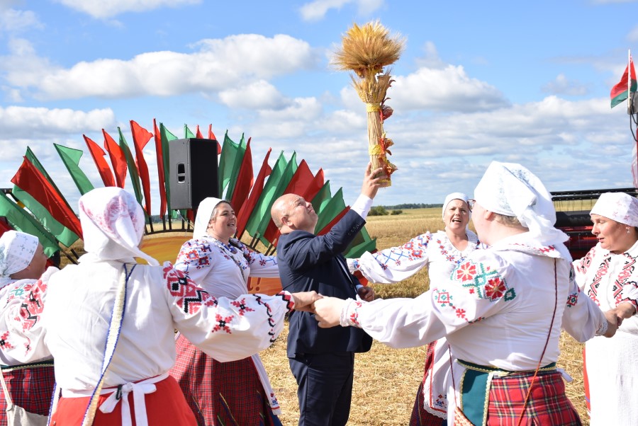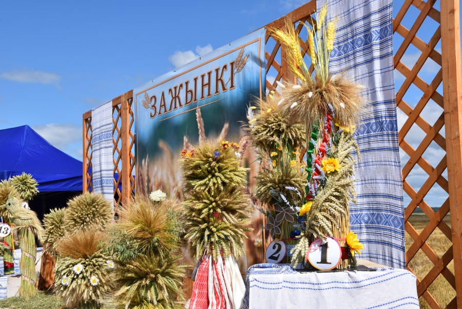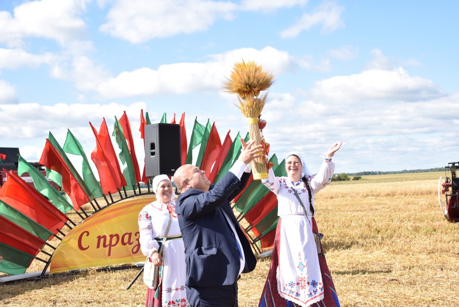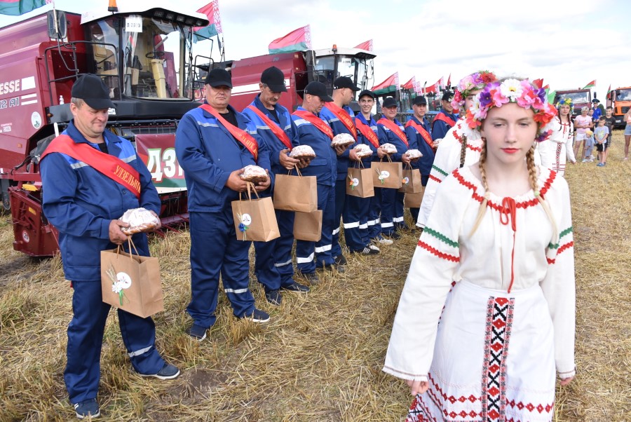 И вот наступает пора жницам по-старинке, серпами, с песнями начинать зажинать уже выспевшее зерно, чтобы затем сделать из него первый зажиночный сноп «на сто коп, на тысячу мерак. Вышэй снапок ад гары и яснейшы ад зары». Вот он – весомый, колосистый, золотой – взлетает в руках Андрея Соколовского высоко в небо. И пока Андрей Валентинович подбрасывает его, все загадывают, чтоб прошла жатва без потерь, чтобы техника не ломалась и чтобы Бог дал здоровья всем участникам жатвы.