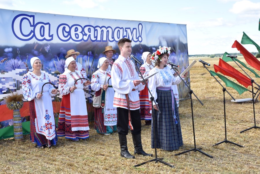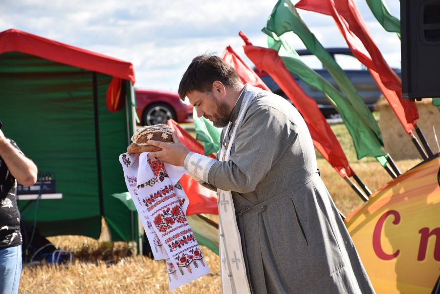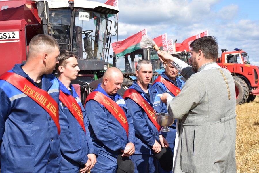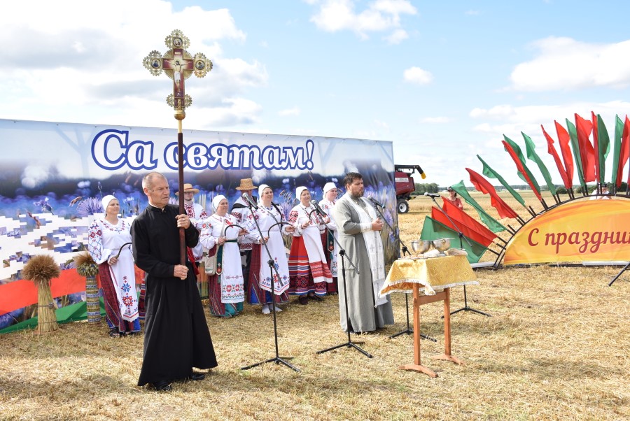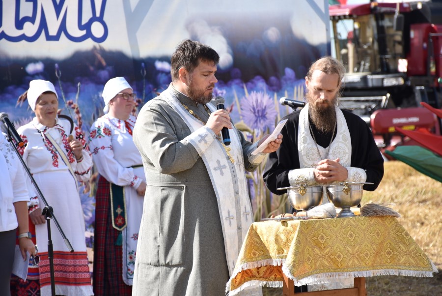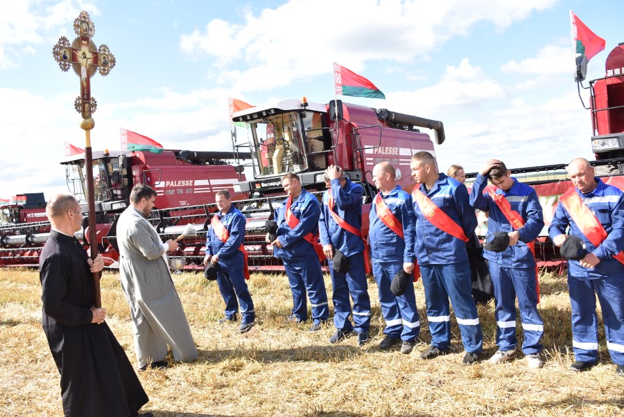 Наши предки знали, что прежде, чем приступить к уборке урожая, нужно было договориться с землей-матушкой и поблагодарить ее за подаренный урожай. За золотое поле – хвала господу Богу. Для того, чтобы не оставлял он нас и на этот раз, помогал в святом деле жатвы, а труды наши сторицей окупались богатым урожаем, на празднике был совершен молебен. Совершил его благочинный Березинской церковного округа протоиерей Илья Гончарук. Он же окропил святой водой поле, технику и участников жатвы. Кроме того, комбайнерам, как встарь, дали в дорогу для укрепления сил не только духовных, но и физических, обязательные белорусские «ссобойки».