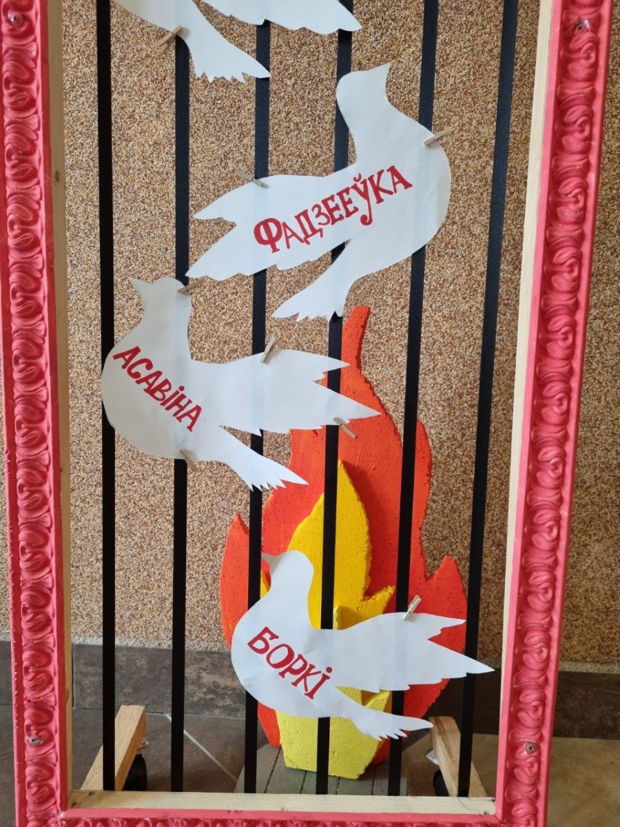 В память о 185 деревнях, сожжённых и не восстановленных после войны, ребята вырезали из бумаги белых голубей, символ мира и созидания, и написали на них красной краской их названия.