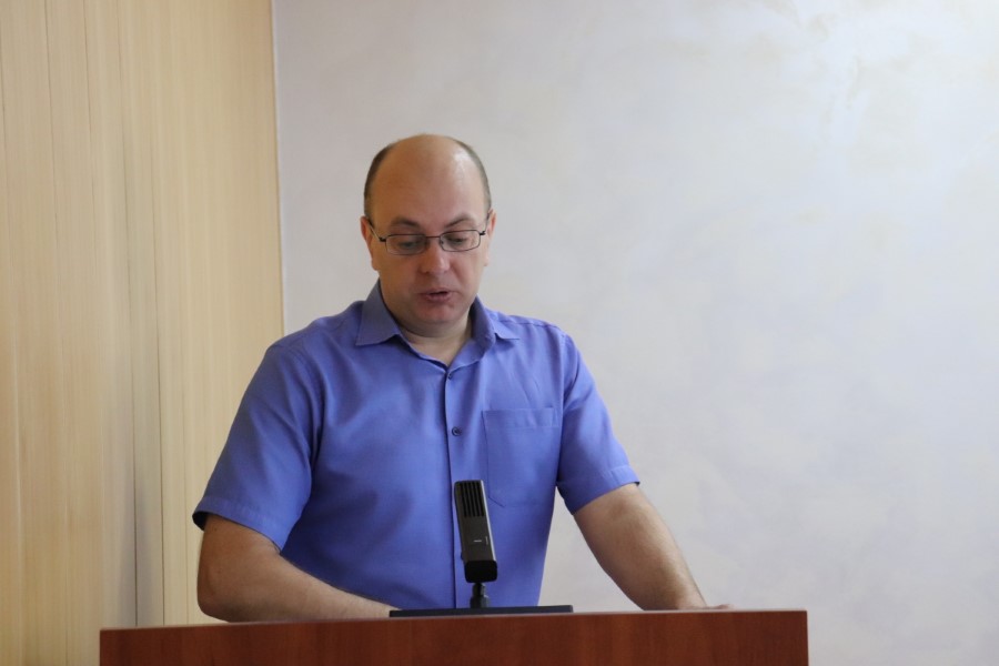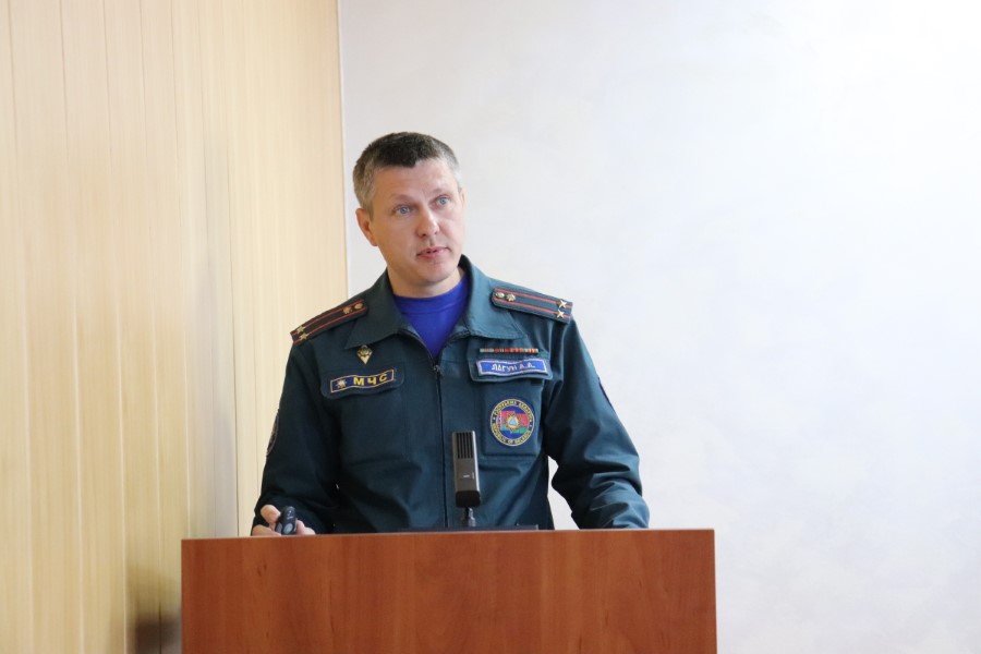 С докладом на тему "Организационные и практические мероприятия по обеспечению пожарной безопасности в сельскохозяйственных организациях при проведении уборочной кампании 2023 года" выступил заместитель начальника Березинского РОЧС Александр Лагун.