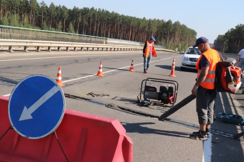 Представители ДЭУ-6 сегодня занимались ремонтными работами по заделке стыковочного шва на мосту, расположенном на трассе Р67 и пересекающем автомагистраль М-4 недалеко от города.