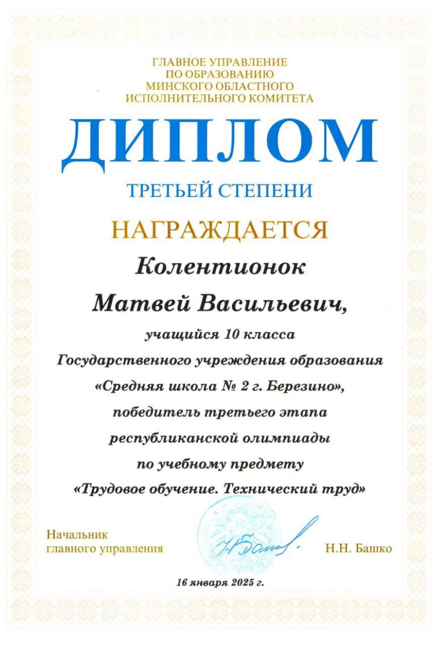 Учащиеся 10 класса ГУО "Средняя школа №2 г. Березино" успешно представили Березинский район на третьем этапе республиканской олимпиады по учебному предмету "Трудовое обучение": Голуб Илья получил Диплом I степени, Колентионок Матвей - Диплом III степени.