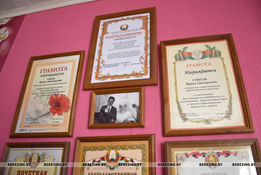 Ирина Григорьевна – медсестра, о которых говорят – от Бога. В терапевтическом отделении Березинской районной больницы она работает уже 30 лет. О том, как работает, свидетельствуют многочисленные благодарности, грамоты, почётные грамоты, которые разместились на стене одной из комнат.