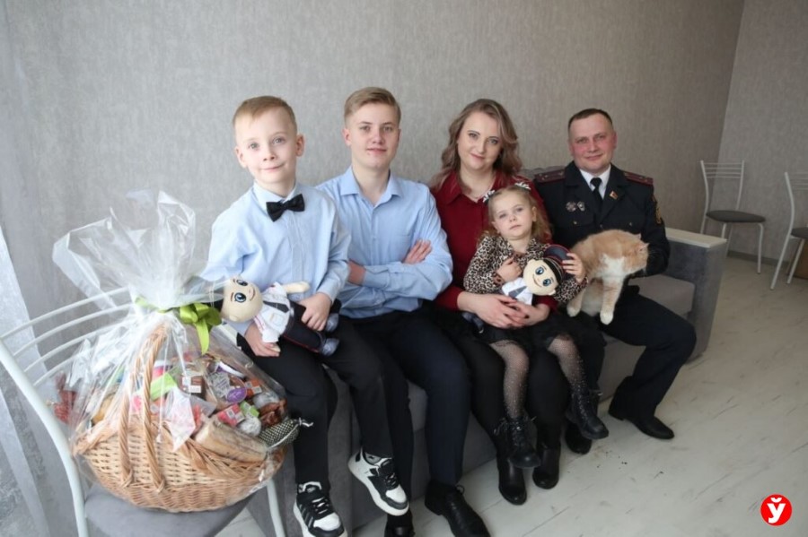 Губернатор вручил семье цветы и корзину с лакомствами от брендов Минской области.