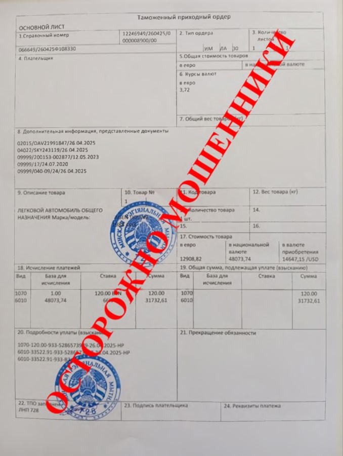 Впоследствии обманутые граждане просят уточнить таможенное оформление транспортных средств с приложением копий таможенных приходных ордеров, удостоверений на ввезенные транспортные средства, квитанций об оплате, уведомительных писем об уплаченном утилизационном сборе. Приложенные документы составлены по не установленной законодательством форме, содержат несуществующие реквизиты и являются поддельными.