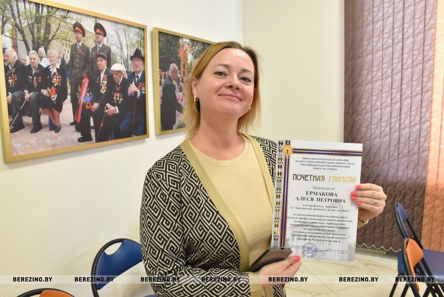 В завершении мероприятия председатель Минской городской организации Белорусского профессионального союза работников культуры, информации, спорта и туризма Сергей Крысенко поздравил накануне Дня работников культуры директора Березинского РЦК Алесю Ермакову с юбилеем и вручил ей Почётную грамоту за многолетний добросовестный труд.