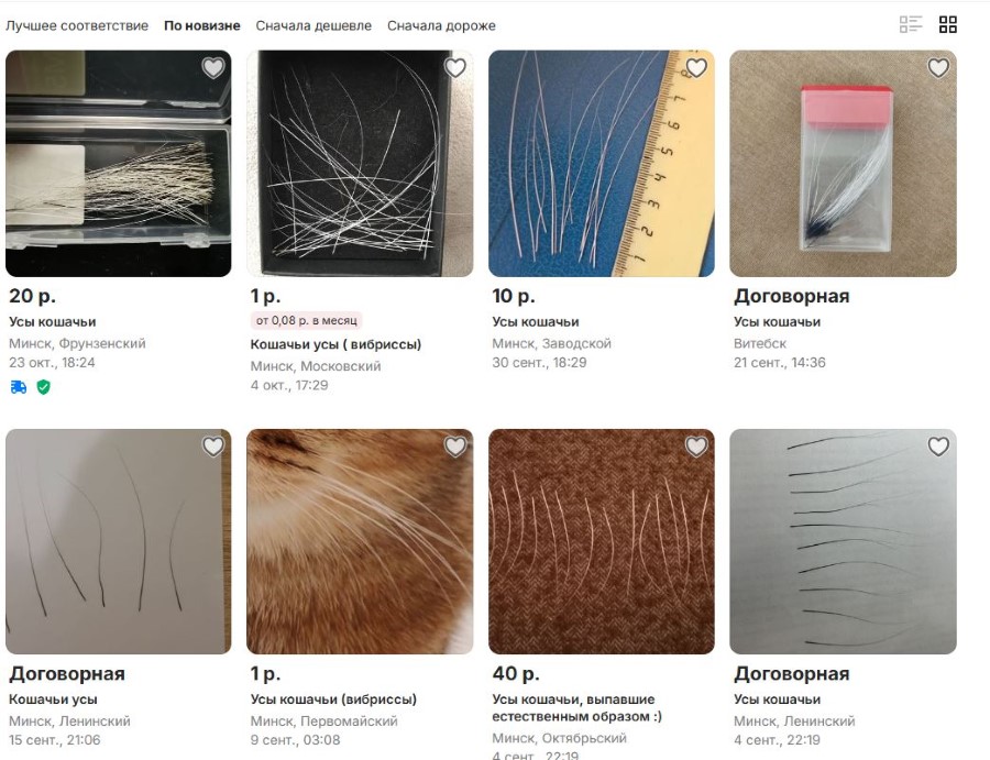 На популярной белорусской площадке выставлено около 10 объявлений о продаже выпавших кошачьих усов. Их продают и поштучно, и оптом, по 50 штук.
