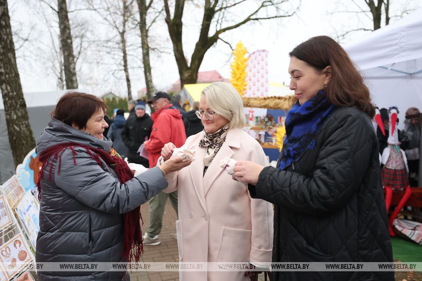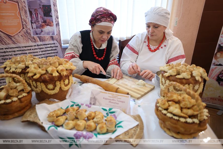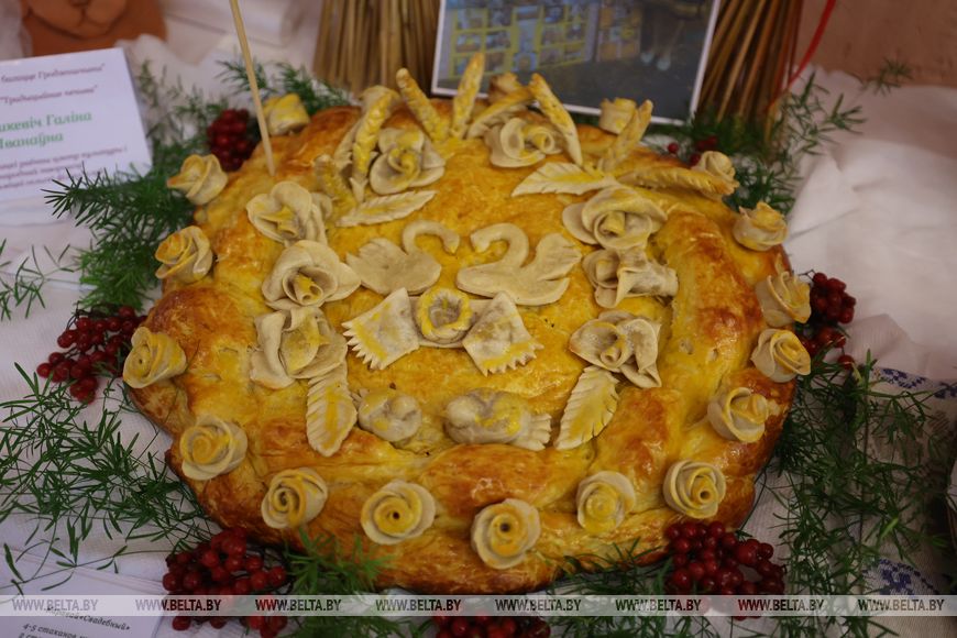 "На такой большой праздник мы привезли свой свадебный каравай. До сих пор на свадьбы у нас пекут такие караваи. Для его приготовления используются самые лучшие продукты, например, для одного из наших караваев весом в 3 кг нужно 1,5 кг муки, она берется самого мелкого помола, самая качественная (хотя раньше наши хозяюшки пекли из любой муки, умения у них были), 4 яйца, 450 г сахара, сливочное масло самой высокой жирности. Перед началом процесса говорится молитва. У каждой хозяюшки есть свои секретики. Процесс, конечно, трудозатратный. Отличительная особенность наших караваев - украшение. Это птички и шишки, символы молодой, новой жизни", - рассказала методист Волковысского районного центра ремесел Оксана Тальковская.
