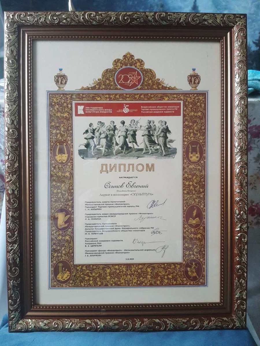 За чвэрць веку ў Яўгенія Осіпава сабраўся вялікі стос дыпломаў, грамат і падзяк за ўдзел у разнастайных фестывалях і конкурсах. Усе яны сведчанне яго творчых пошукаў і перамог. Дыплом лаўрэата вядомай Міжнароднай прэміі з’яўляецца яскравым пацвярджэннем і прызнаннем яго таленту на міжнародным узроўні.