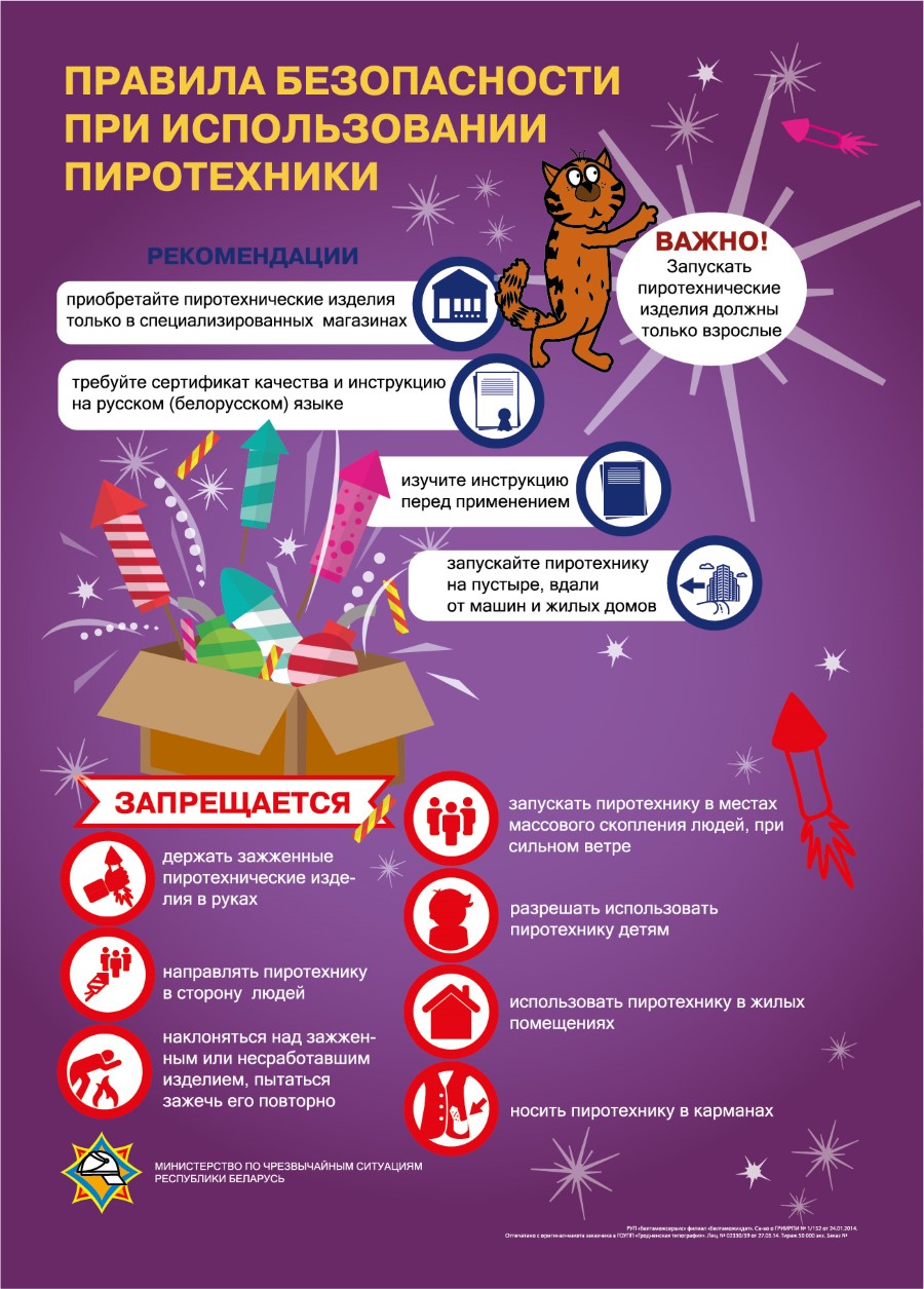 Помните, что использовать пиротехнические изделия могут только взрослые, дети могут наблюдать на безопасном расстоянии. Четко следуйте инструкции по применению, соблюдайте необходимые расстояния при запуске пиротехнических изделий. Запрещено их запускать в местах массового пребывания людей, вблизи зданий, линий электропередач. Ожоги рук, лица, глаз, оторвание фалангов пальцев – самые распространенные травмы при неправильном использовании пиротехники. Спрашивайте у продавца о наличии сертификата соответствия на изделие, инструкции на русском языке. Помните, что при неправильном использовании могут быть неприятности даже от использования бенгальских огней.