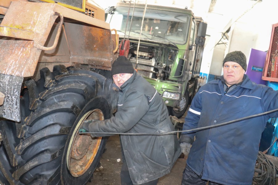 Параллельно с этим в хозяйстве идет подготовка техники к предстоящему техосмотру. Назначен он на 20-е число. Его рассчитывают также пройти успешно. Сейчас в мастерских ведутся последние к нему приготовления. Так, за работой мы застали оператора «Амкодора» Александра Слабко, который ремонтировал колесо. Помогал ему механизатор Алексей Якуш, который уже справился отладить свой энергонасыщенный МТЗ-3522.