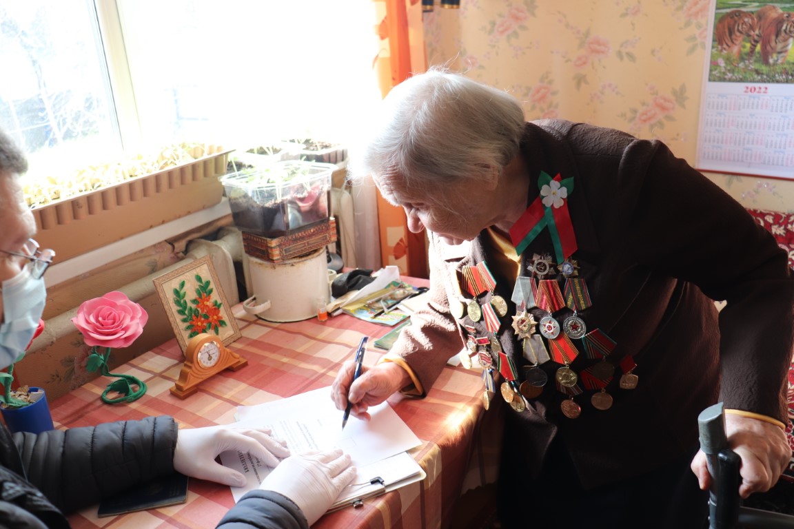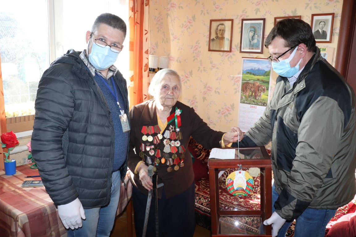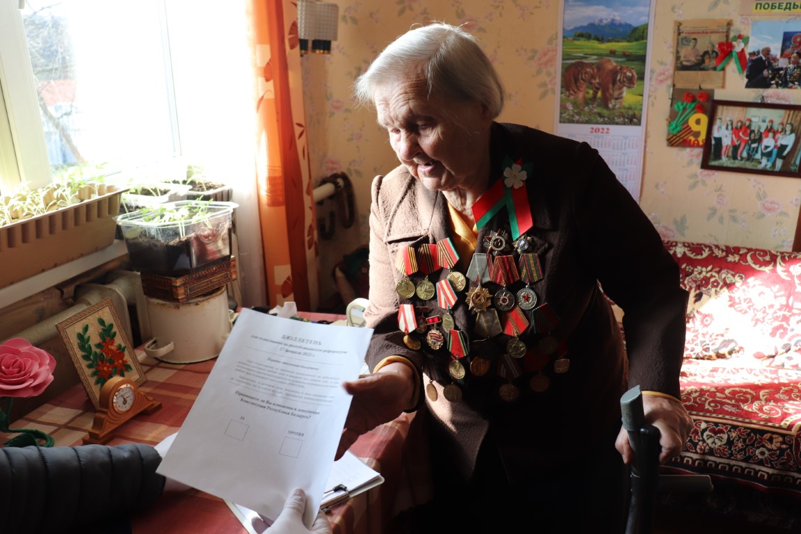 – Галасую за мір! – цвёрда агучыла яна сваё рашэнне, апускаючы бюлетэнь у перанасную урну, калі да яе прыбылі члены ўчастковай камісіі. – За мір і за новую Канстытуцыю, якая забяспечвае беларусам годнае і слаўнае жыццё, а нам, пажылым людзям, — шчасліую старасць і клопат. Веру, што неба над Беларуссю заўсёды будзе чыстым і светлым. Шчыра жадаю ўсім дабра і радасці ў жыцці і няхай яго ніколі не азмрочваюць ніякія патрасенні. Веру, што мы заўсёды знойдзем сілы супрацьстаяць любым замахам на нашу свабоду.