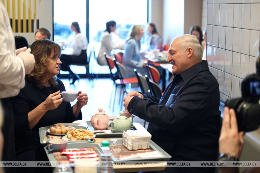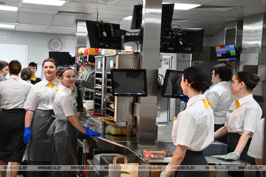Александр Лукашенко пообщался с персоналом, который работает в ресторане. В основном здесь трудится молодежь, но некоторые сотрудники ресторана остались в сети "Мак.бай" после ухода "Макдональдса". Президент поинтересовался, как поменялись условия работы в ресторане под новой вывеской. Работники, которые начинали еще с "Макдональдса", признались, что даже не заметили разницы после ухода американского бренда.
