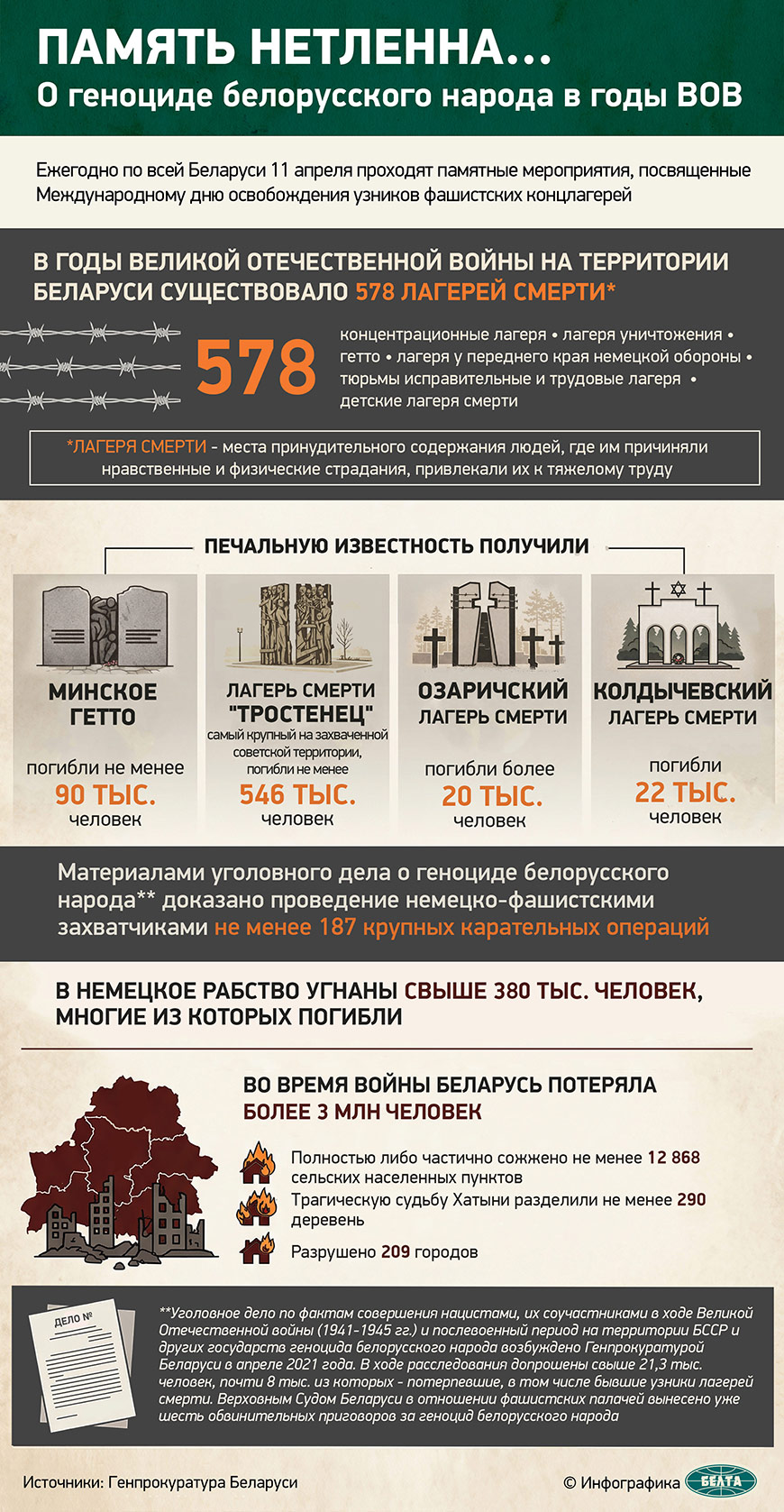 Согласно данным, опубликованным на сайте ведомства, на территории Беларуси действовало 578 лагерей смерти. Наиболее крупные из них находились в Минске, в районе Немиги, и Тростенце, а также в Озаричах, Гомеле, Полоцке и Бобруйске. В годы Великой Отечественной войны Беларусь потеряла около 3 млн человек - это каждый третий житель республики.