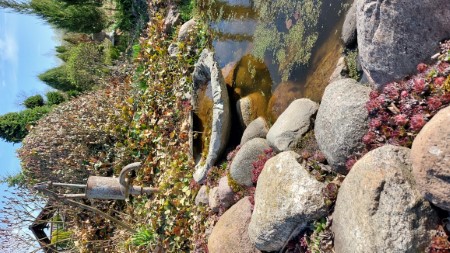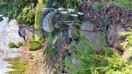 – Немного дальше, – показывает Елена Николаевна, – оформлен маленький декоративный пруд, где журчит ручеек, который обложен камнями. Эту зону можно украсить различными декоративными статуэтками, кувшинами и многим другим. У меня летом здесь поселяется моя любимая фея. Я усаживаю её на край питьевой чаши для птиц, которая также сделана из цемента своими руками. Около ручейка можно посадить ваши любимые цветы, чтобы композиция была полностью законченной. У меня ещё рядом находится стальная цапля, её мне привезли в подарок из Германии.