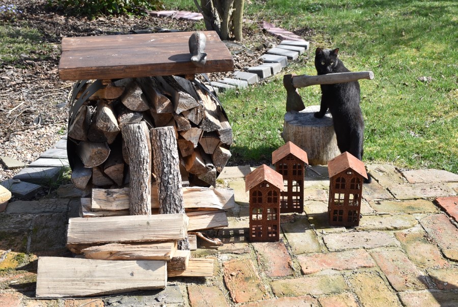 Стационарный очаг для костра можно также сделать из бетона своими руками. Проще, конечно, купить готовую стальную костровую чашу. Я покупала чашу «Gala», производитель Борисовский завод. Костровые чаши являются прекрасной современной альтернативой классическому костру. Здесь же расположена дровница, на неё я положила дощечку, получился столик, а на столик установила металлического котика, который смотрит вниз, как будто проверяет, достаточно ли дров в дровнице?! Рядом – поленница с топором. Каждая деталь – на своём месте. Костровую зону нужно обязательно делать с учётом правил пожарной безопасности.