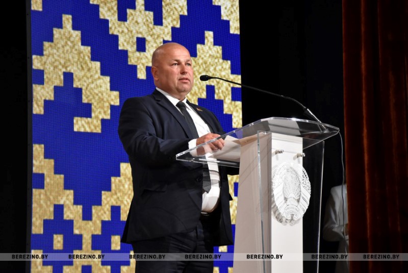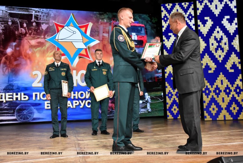 Затем на сцену один за одним начали подниматься гости праздника. Причем, не только поздравить огнеборцев с их профессиональным праздником, но и вручить грамоты за активное взаимодействие в работе. Первым эту церемонию открыл прокурор Березинского района Василий Вербицкий. Он вручил благодарности прапорщику внутренней службы Артему Горошко - старшему инструкторы ПАСП №13 и прапорщику внутренней службы Дмитрию Тюлюпо – водителю ПАСП №12.