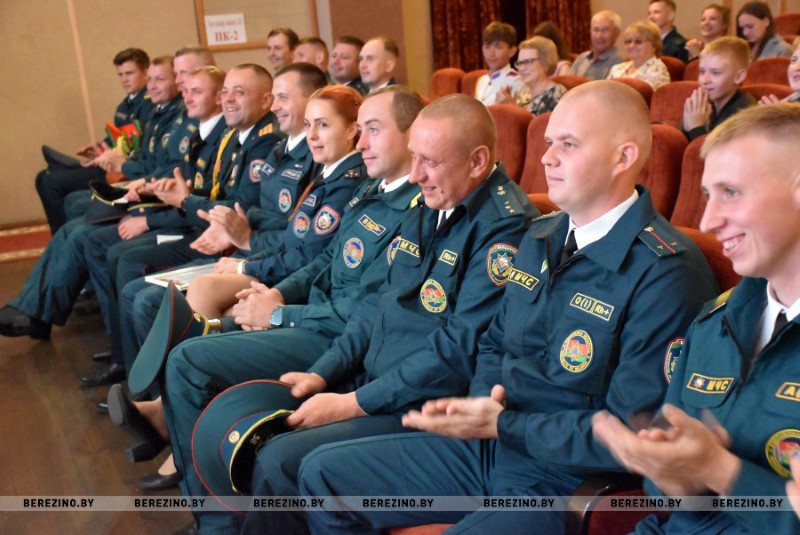 В завершении мероприятия к собравшимся обратился Николай Андриевич. Он от имени республиканского добровольного пожарного общества вручил нагрудный знак “Сто лет со дня образования Всебелорусского добровольного пожарного общества” начальнику Березинского РОЧС Ивану Мазанику, майору внутренней службы Констанину Богачу – инспектору инспекции надзора и профилактики, старшему лейтенанту внутренней службы Наталье Киселевой – оперативной дежурной центра оперативного управления. Нагрудный знак “За заслуги” был вручен старшему лейтенанту внутренней службы Алексею Кривороту – заместителю начальника РОЧС..jpg)