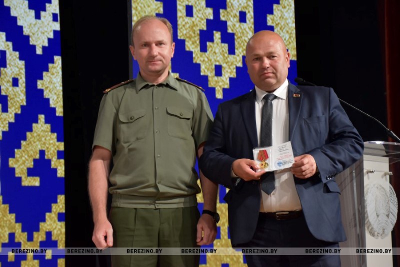 А вот военный комиссар Червенского и Березинского районов Миской области Александр Кахнович не только вручил грамоты сотрудникам РОЧС старшему прапорщику внутренней службы Андрею Нестеровичу – старшему инструктору-спасателю ПАСП №12 и старшему сержанту внутренней службы Захару Гаджиеву – водителю ПАСП №12. Он также вручил юбилейные медали “80 лет Победы в Великой Отечественной войне 1941-1945 гг” председателю Березинского райисполкома Андрею Соколовскому, начальнику РОВД Вадиму Конопацкому, прокурору района Василию Вербицкому, начальнику РОЧС Ивану Мазанику и начальнику Березинского отделения департамента “Охрана” Даниилу Таратину.