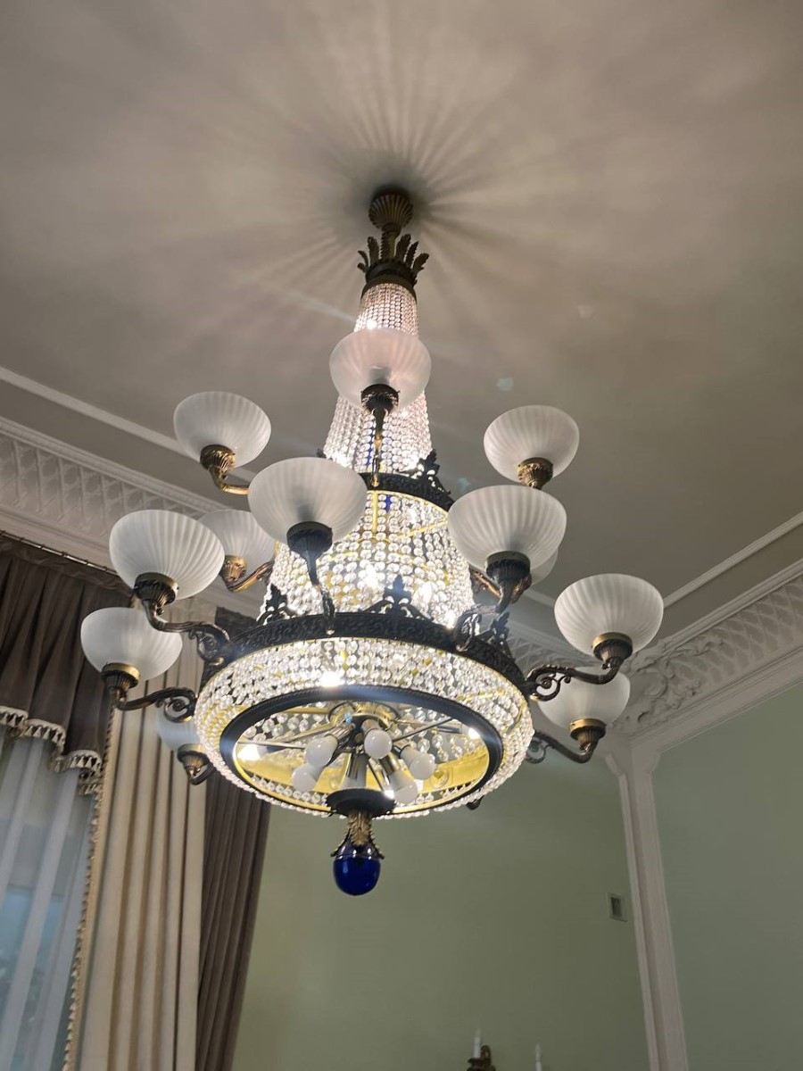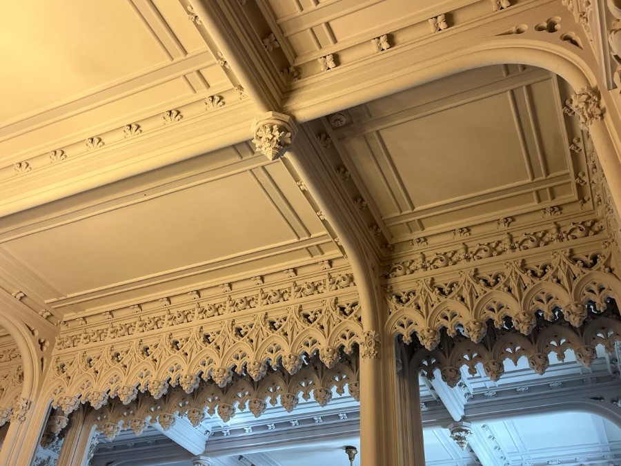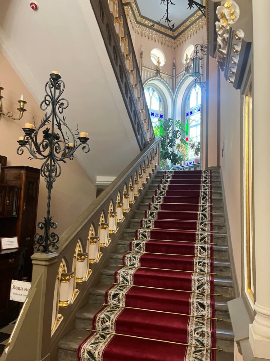 Внешний облик усадебного дома украшают шатры башен, мансардные крыши, встроенные на главном входе фигуры горгулий. А внутренние залы — своего рода путеводитель по истории архитектурных стилей в интерьере. Здесь сочетаются элементы более десяти стилей — готический и романский, рококо, маньеризм, барокко, классицизм…