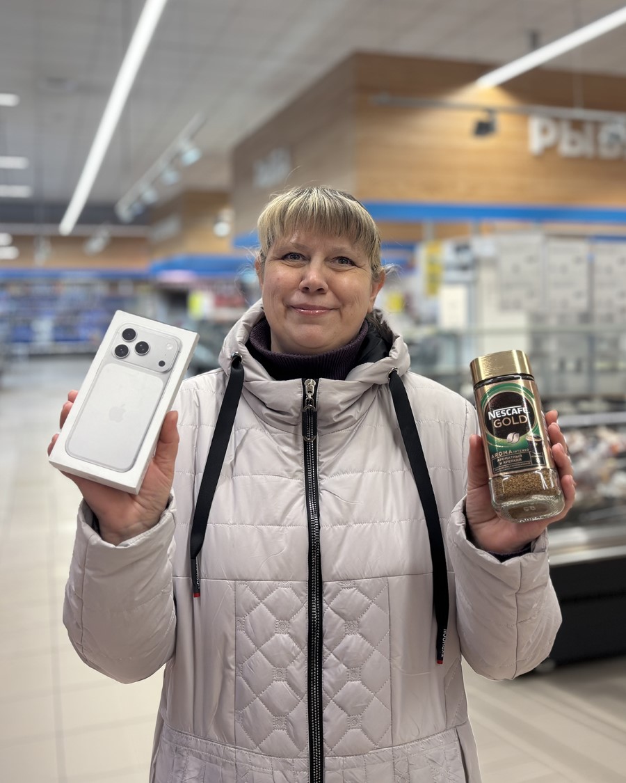 Анжела работает контролером‑кассиром в торговом комплексе БГЭУ. Магазины сети «Санта» она посещает почти каждый день и очень довольна ассортиментом. В тот день зашла в магазин на улице Якубова: нужно было купить продукты ко дню рождения мамы. Обычный кофе NESCAFE в её чеке оказался не таким уж и обычным – именно он помог выиграть iPhone 17 Pro.