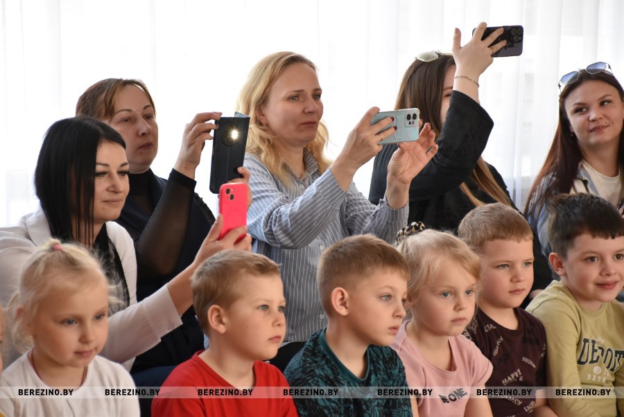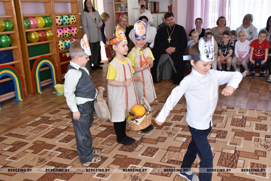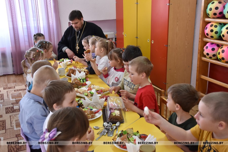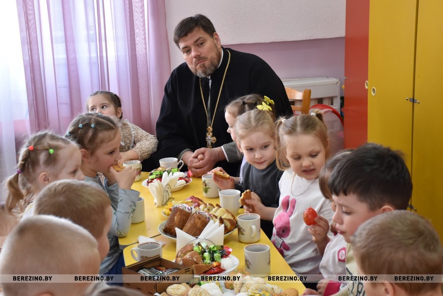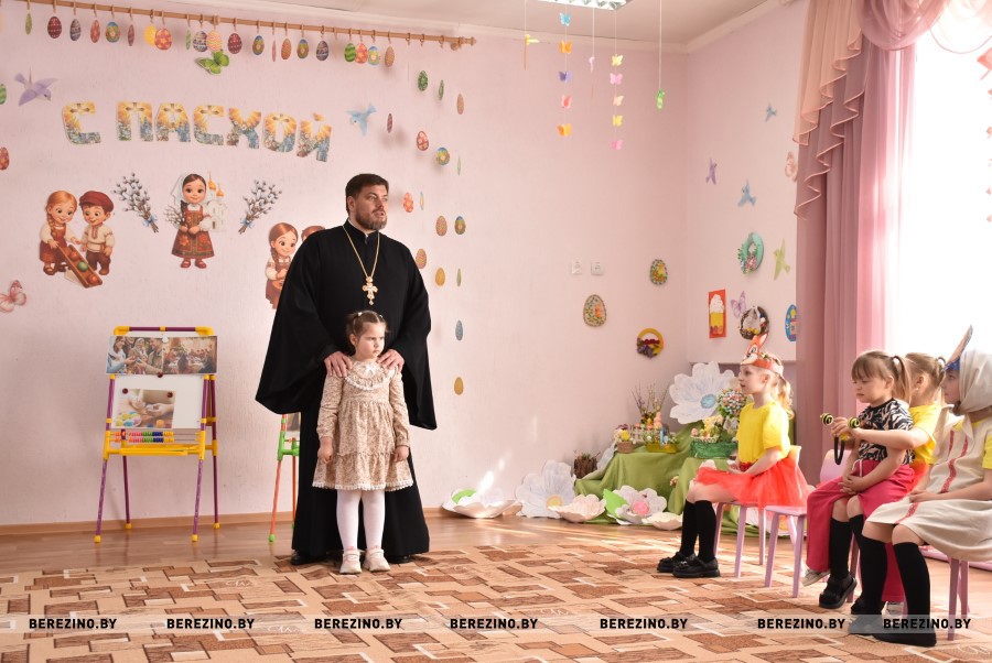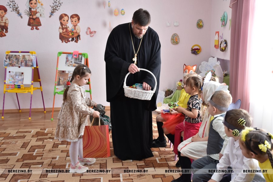 Благочинный Березинского церковного округа, протоиерей Илья Гончарук поздравил всех участников праздника со светлой Пасхой и вместе со своей младшенькой дочерью вручил детям пасхальные подарочки и пригласил на экскурсию в храм, на колокольню. Пасхальный звон колоколов оповещает о торжестве добра и света и сопутствует всем пасхальным действиям.