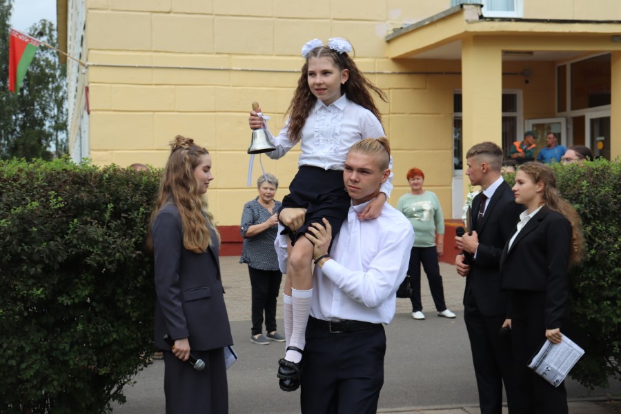 Школьники выступили с поздравительными музыкальными номерами. Право же дать первый звонок было предоставлено ученику 11 класса Кириллу Пармановичу и ученице 5 класса Полине Пинчук.