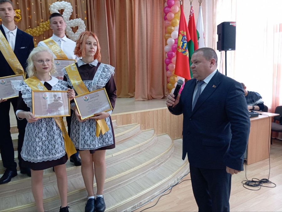 - Дорогие выпускники, уважаемые родители, педагоги, гости! Дорогие ребята, сегодня завершается первый важный этап вашей жизни. Для вас прозвенел последний школьный звонок. Впереди экзамены, дорога к новым вершинам и желание идти вперед. Позади детство, школьные годы, наполненные не только учебными заботами, но и проблемами, а также радостью познания мира, обретения друзей, первых победы. Уверен, что в памяти вас навсегда останутся теплые и радостные воспоминания о школьных друзьях, дорога знаний, которую вы шли все эти годы, приведет к новым удивительным открытиям. А ваши энергия и талант послужат на благо Березинского района! – сказал Олег Иванович. – Каким бы не были школьные годы трудными или полными радости, выпускной бал всегда наполнен каким-то особенным смыслом. Поэтому он должен остаться в памяти добрым и светлым воспоминанием: как самый лучший и торжественный день в школьной жизни, как праздник дружбы и верности, красоты, и юности. Желаю вам крепкого здоровья, хорошего настроения и успехов во всех начинаниях! Поздравляю вас с этим праздником! От души больших вам успехов, ребята!