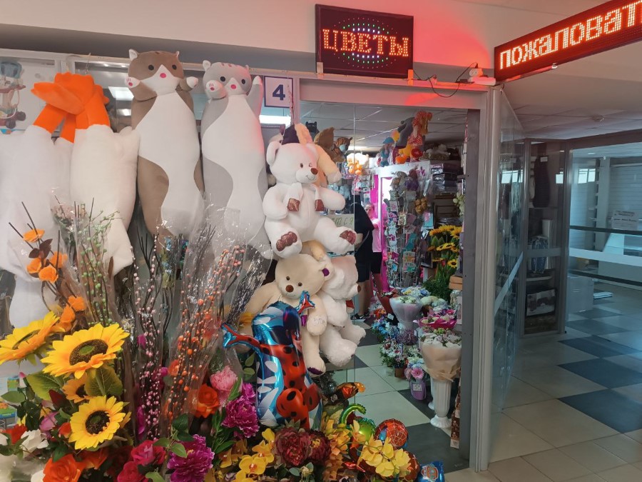 Для начала зайдем в магазин «Цветы», который расположен в центре города, с заднего входа здания гостиницы. Тут не много места, но на полочках расположились различные сувениры и скульптурки. И, конечно, есть цветы.