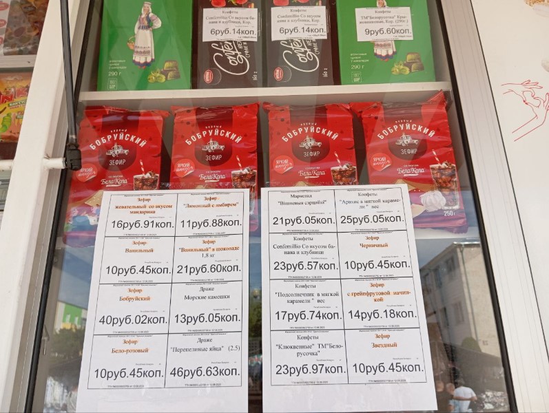 На локации известного бобруйского производителя сладостей «Красный пищевик» у покупателей разбегались глаза от выбора различных видов зефиров. Он здесь был «Жевательный со вкусом мандарина», «Ванильный», «Лимонный с имбирем», «Ванильный в шоколаде», «Черничный», и с грейпфрутовой начинкой. Продавались драже «Морские камешки» и «Перепелиные яйца». Был представлен большой выбор конфет, пастилы, халвы, козинак и мармелада. Традиционно в этом месте в очередь выстраивались женщины.