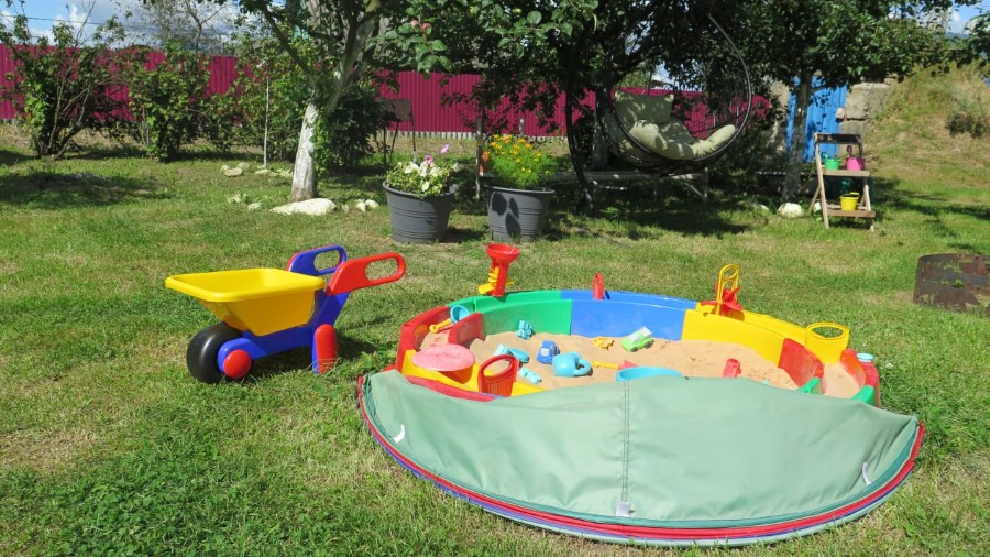 За домам, ва ўнутраным дворыку, ёсць невялічкая лазня. Крэслы, у якіх можна адпачыць. Пясочніца з лялькамі для гадавалага ўнука.