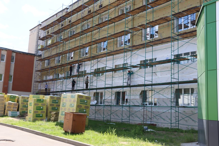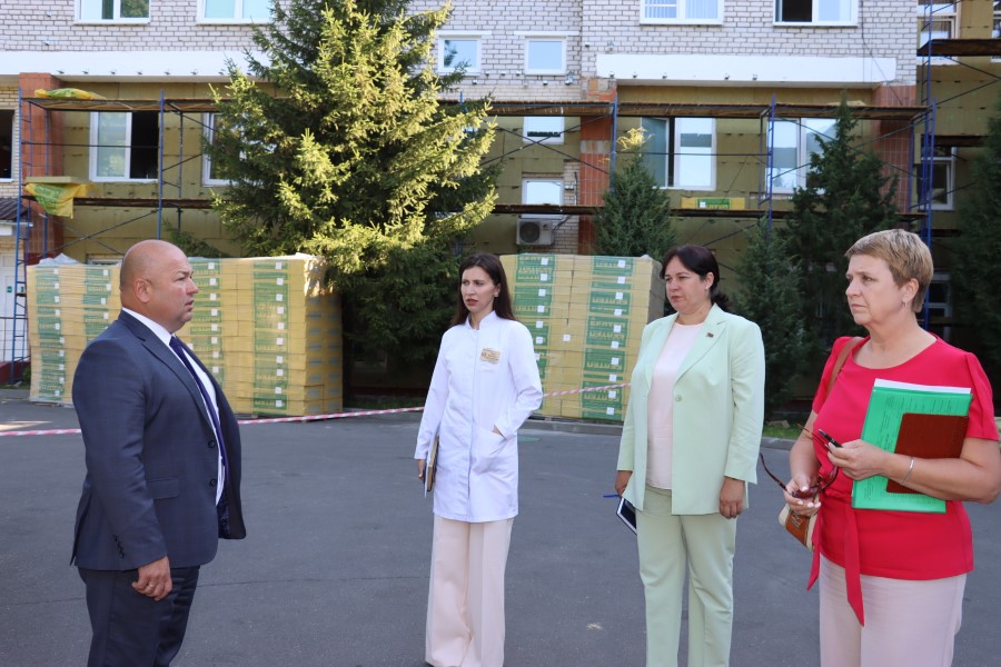 В ходе посещения объекта ознакомился с ходом ремонта терапевтического корпуса, где будет установлен КТ, оценил идущий ремонт фасада здания ЦРБ.