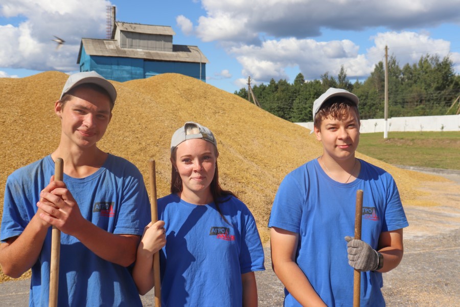 Здесь же, среди огромных гор доставленного с полей зерна, видим несколько ребят-подростков с метлами. Это ученики местной Любушанской школы Станислав Павлович, Карина Коток и Андрей Корниенко. Отработав смену в студотряде, а она началась 18 июля, многие старшеклассники решили и дальше оказывать помощь родному хозяйству. Таких сегодня 13 человек. Работают они в две смены по четыре часа. Без дела не сидят и сами, без дополнительных указаний и распоряжений, видят где именно нужно их участие. Их основная задача – вовремя смести просыпавшиеся зерна и поддерживать идеальную чистоту площадки. ПО словам старших товарищей, со своей задачей ребята справляются хорошо и не имеют нареканий.