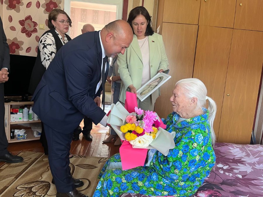 Представительная делегация: председатель Березинского райисполкома Андрей Соколовский, председатель районного Совета депутатов Владимир Трухан, заместитель председателя райисполкома Алеся Титова, начальник отдела идеологической работы, культуры и по делам молодежи Наталья Жуковская, начальник управления по труду, занятости и социальной защите Вероника Джигеро, председатель районного совета ветеранов Анатолий Зябко, музыканты поздравляют ветеранов