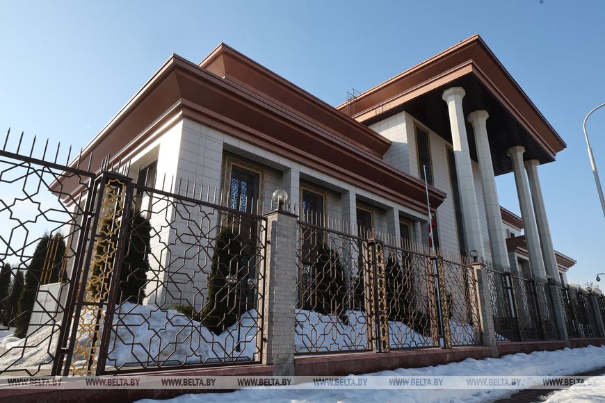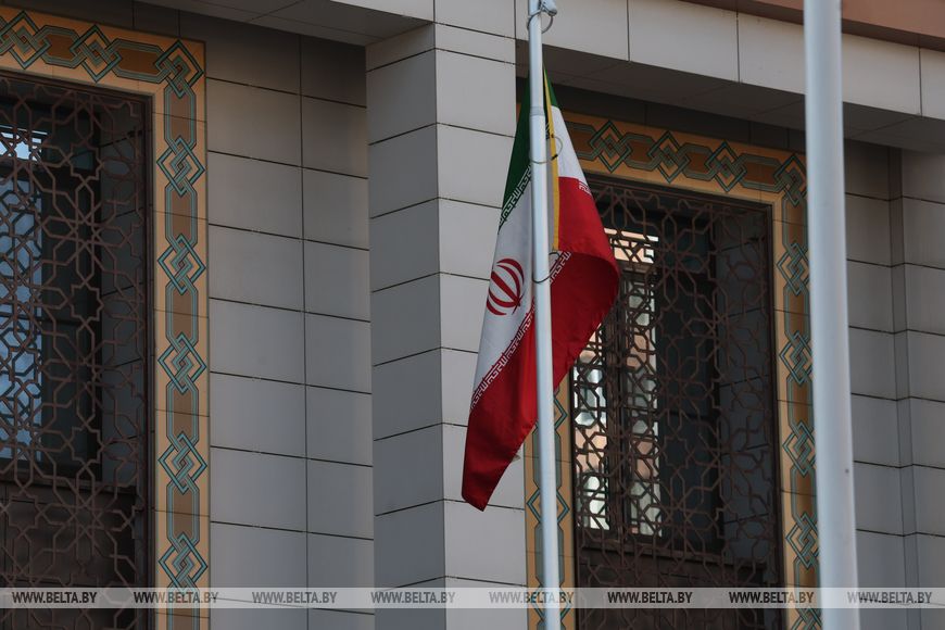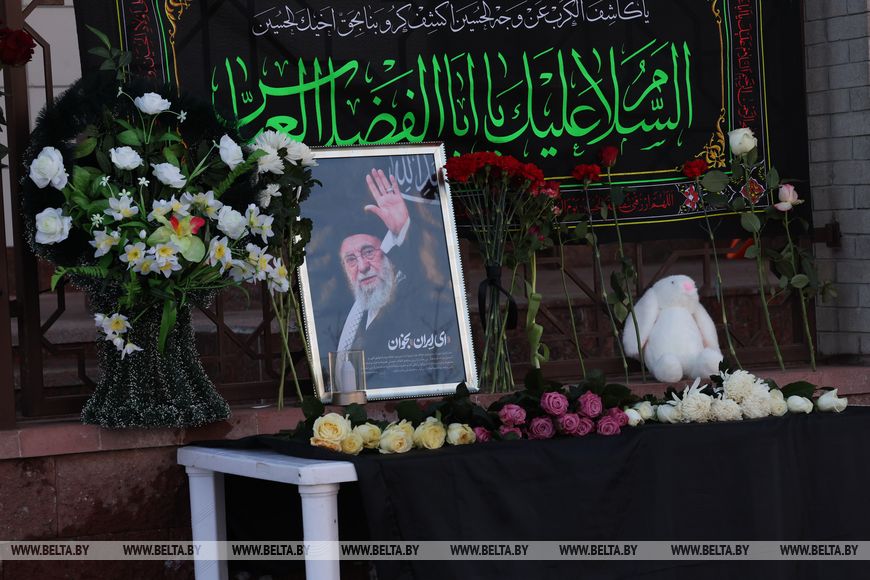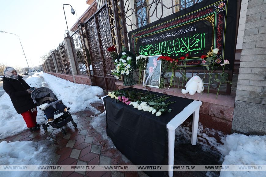 В знак скорби в связи с гибелью мирных граждан в Исламской Республике Иран к зданию посольства Ирана в Минске несут цветы и детские игрушки. Флаг на здании посольства приспущен.