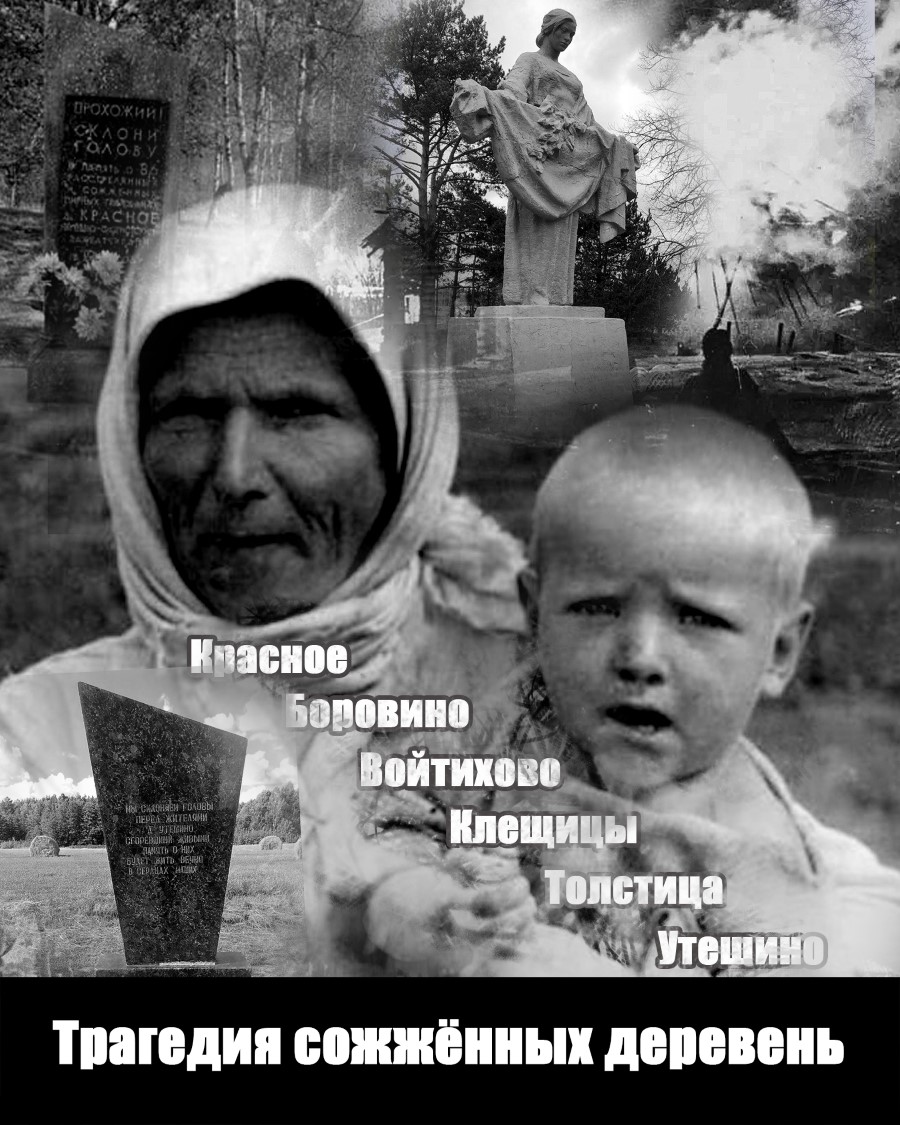 Собирательный образ жертв сожжённых вместе с жителями 6 березинских деревень: Боровино, Красное (возрождены после войны), Утешино, Толстица, Войтихово, Клещицы (не возродились после войны). Изображены женщина с ребёнком на фоне сожжённой деревни. Мальчик – сын Фальковских, расстрелянных карателями во время акции сожжения деревни Боровино. Тела родителей, падая, прикрыли сына, и он выполз из пылающего здания. Прибежал в соседнюю деревню Белица без верхней одежды, весь в крови и рассказал о трагедии… На заднем плане изображения памятников трём сожжённым в годы войны деревням Боровино, Утешино и Красное.