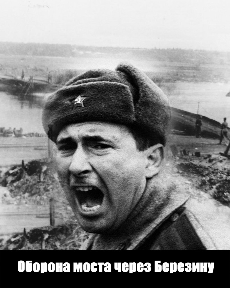 На заднем плане довоенный деревянный 200-метровый мост через Березину. На переднем плане лицо советского солдата – собирательный образ бойцов 155-ой и 100-ой стрелковых дивизий, 7-ой воздушно-десантной бригады, которые вели оборонительные бои за мост через Березину в июне-начале июля 1941-ого. В 1978 году на месте боёв минскими следопытами найдено в гильзе письмо последнего защитника моста Алексея Валюка. Текст письма из 1941-ого представлен на памятнике возле поворота автодороги М4 на Березинское торфопредприятие.