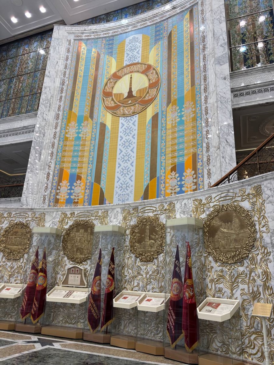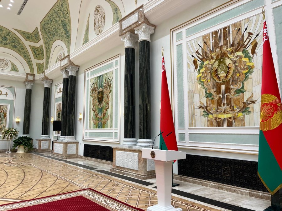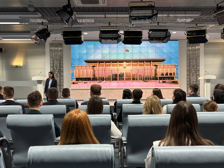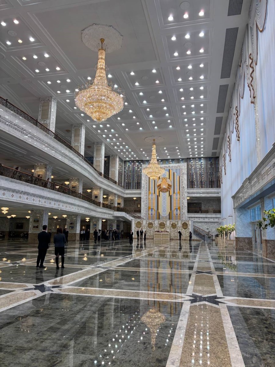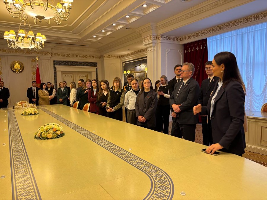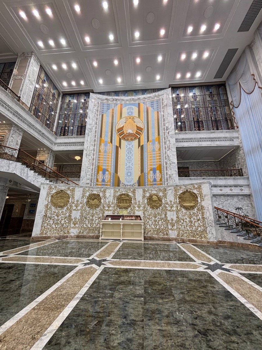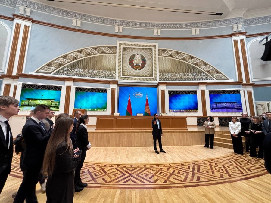 Во время экскурсии пресс-секретарь Президента Республики Беларусь Наталья Эйсмонт поделилась с посетителями историей Дворца Независимости, а также рассказала много другой интересной информации. К примеру, многие даже не предполагали, что зал торжественных церемоний является самым большим в Беларуси, а диаметр самого большого герба во дворце – 5,5 метров (его вес достигает почти 1,5 тонны).