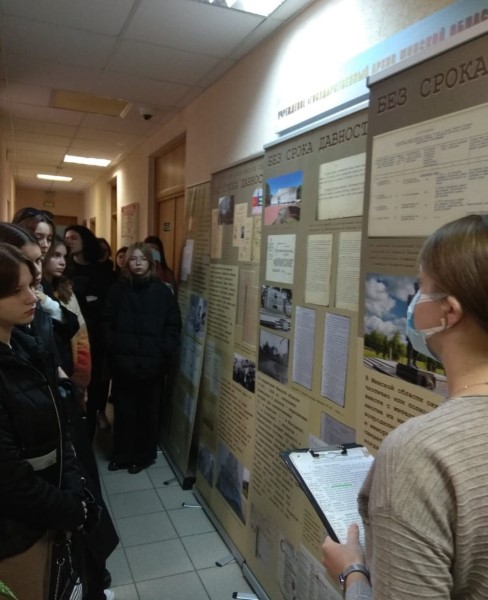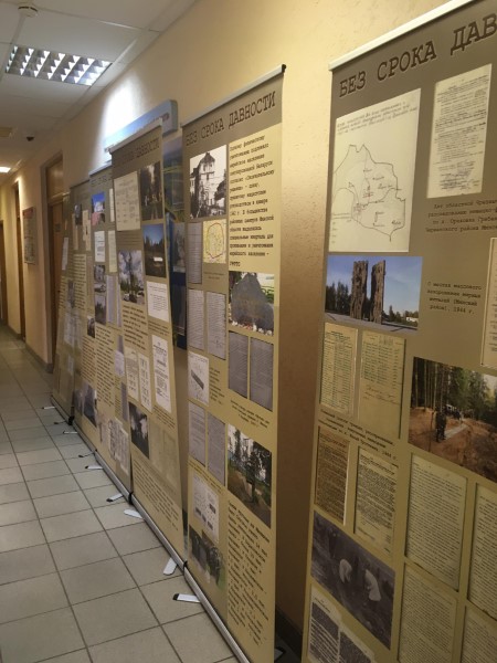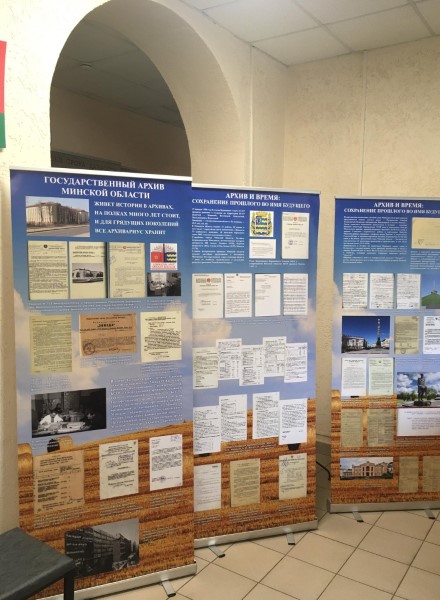 В холе архива у посетителей была возможность ознакомиться с баннерной выставкой, посвященной 100-летию архивной службы «АРХИВ И ВРЕМЯ: сохранение прошлого во имя будущего», где были представлены документы о формировании архивной службы в стране, а также о создании и становлении архива Минской области. Здесь же в холе учреждения участники мероприятия могли ознакомиться с баннерной выставкой «Без срока давности», посвященной теме геноцида мирного населения в годы оккупации на территории Минской области. Документы, представленные на этой выставке, свидетельствуют о бесчеловечных преступлениях нацистов и их пособников по отношению к мирному населению. На выставочных баннерах размещен список сожженных деревень области, список военнопленных по лагерю Масюковщина, списки советских граждан, угнанных в немецкое рабство, а также другие документы, рассказывающие о целенаправленном плане геноцида.