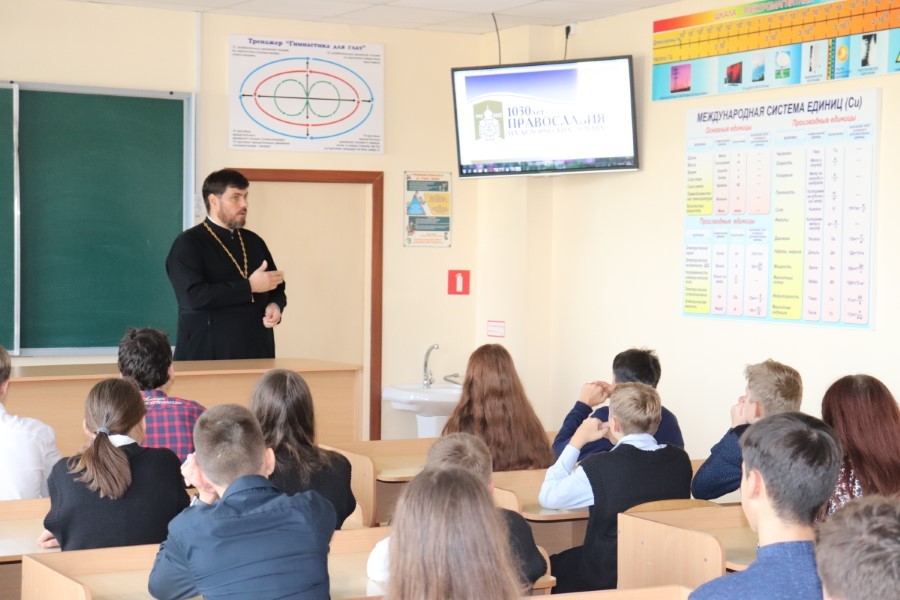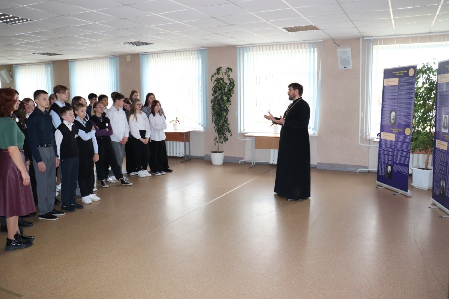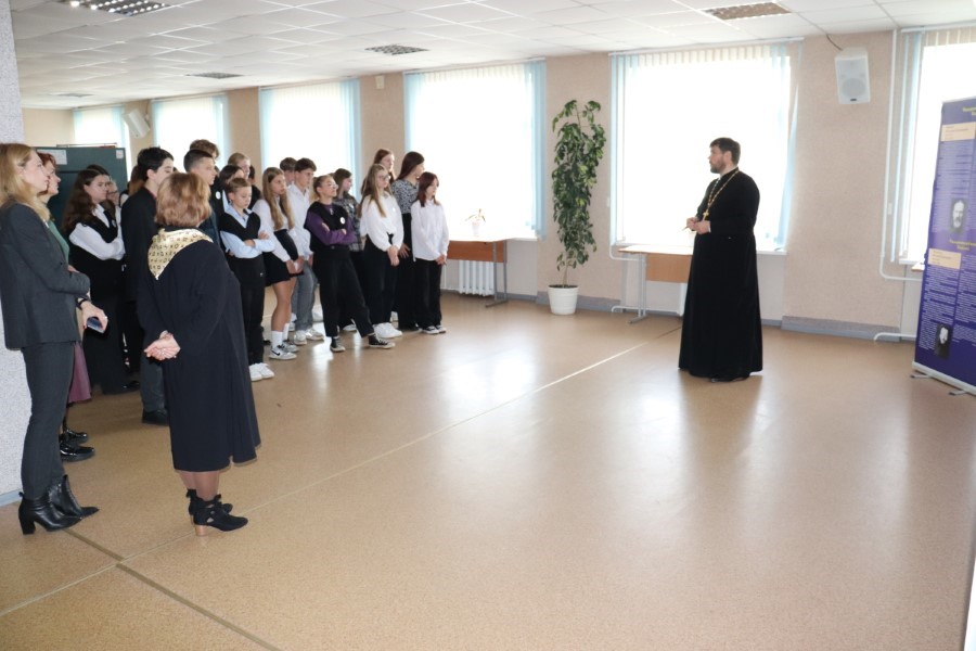 На встрече с гимназистами, учениками 8 класса, присутствовал благочинный Березинского церковного округа, настоятель Никольского храма, протоиерей Илья Гончарук.