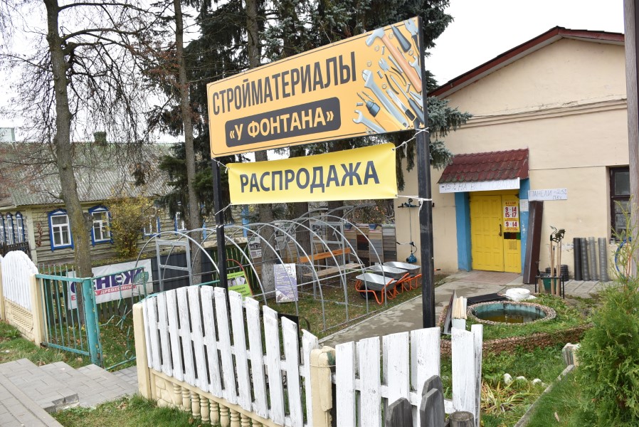 Перед вещевым рынком УП «Березинский автотехсервис» виимание привлекает объявление «Распродажа» рядом с вывеской «Строительный магазин « У фонтана».. Неужели решение о закрытии владелец принял на фоне последних изменений о ценообразовании? Оказывается, нет. Обьявление о распродаже висит тут уже с весны. Тяжело тягаться такому небольшому магазинчику с крупными гипермаркетом «Мастак» и не хватает свободных средств выполнить все требования к зданию.