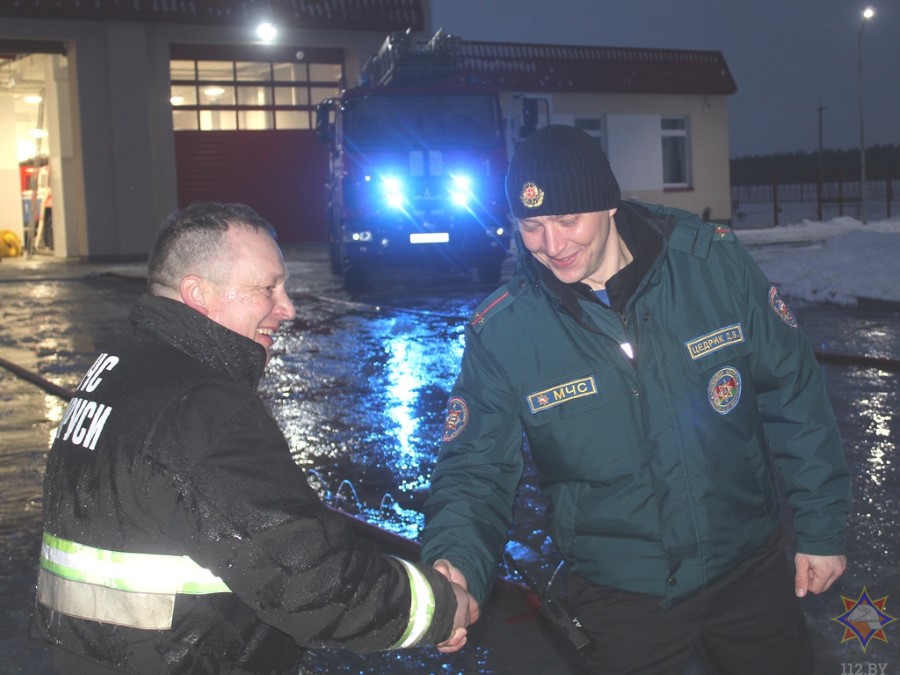 Для того, чтобы последние боевые сутки запомнились, работники отдела организовали для Евгения Анатольевича своеобразное учение: на территории пожарной части г.Березино ему пришлось спасать пострадавшего, находящегося на втором этаже учебной башни. Также начальник отдела Иван Сергеевич Мазаник вручил спасателю символическое удостоверение без срока давности, которое всегда будет напоминает о службе и последней смене.