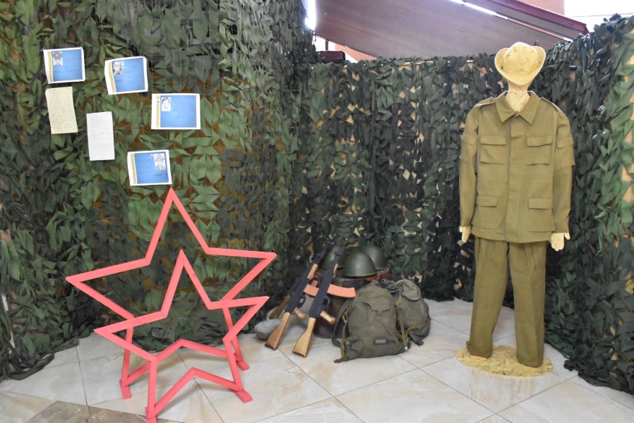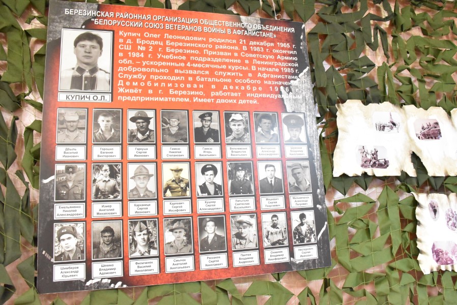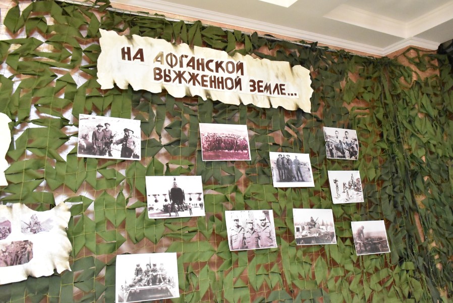 …Чырвоныя кветкі на чорным каменні, імёны на мармуровай дошцы, слёзы ў вачах маці, якія так і не дачакаліся сваіх любых з той не зусім зразумелай вайны на далёкай афганскай зямлі. І яшчэ форма колеру “хакі”, мноства пажоўклых ад часу чорна-белых фотаздымкаў, з якіх на нас глядзяць вайскоўцы… Усё гэта экспанаты кампазіцыі “На выженной афганской земле”.