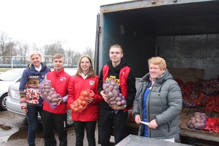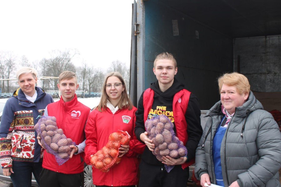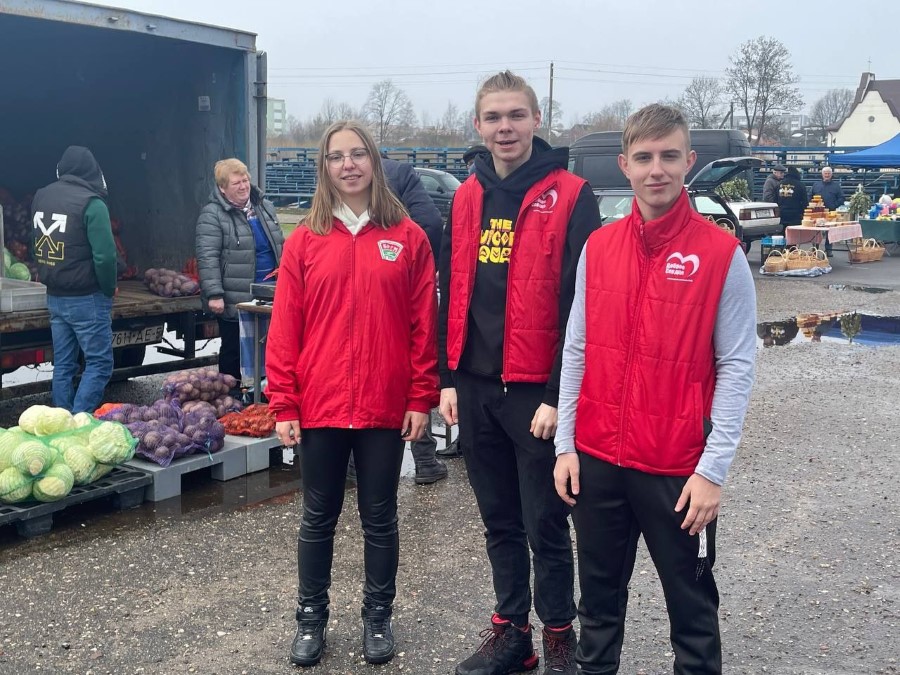 Тут жа, сярод пакупнікоў, бачым першага сакратара РК БРСМ Кацярыну Аўрамчык у акружэнні вучняў гімназіі Яны Бурцавай, Стаса Андроцкага і Кірыла Пармановіча. Юныя валанцёры сталі ўжо неад’емнай часткай праводзімых кірмашоў і надзейнай дапамогай састарэлым і адзінокім людзям пры набыцці тавару і яго дастаўцы дамоў.